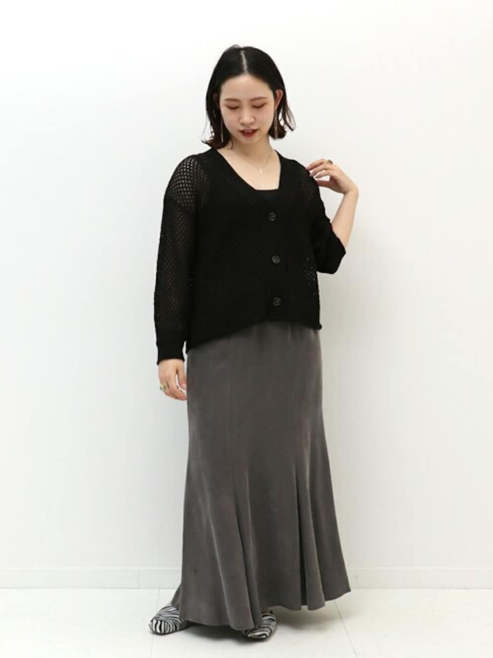夏まで着られる長袖。 涼しげなメッシュ素材は、軽い素材感でトップス向きなカーディガン。程よく腰にかかるくらいの丈感なので、インしなくても上半身をスッキリとした印象に。編み目が荒すぎないので、タンクやキャミなどのインナーにそのまま合わせるだけでも◎ブラックは、インナーと色味を揃えれば、セットのようにまとまります♩ 【メッシュニットVカーディガン】 ----- 着心地 ----- サラッと気楽に羽織れる着心地で、とっても軽いです。 通気性抜群なので、汗ばむ春夏にオススメのアイテム。 ----- サイズ感 ----- 前後差があり、前はウエストくらいですが後は腰にかかる丈感。コンパクトめなスッキリとしたサイズ感です。腕まわり、身幅には余裕があるのでロンTなどをレイヤードしても透け感を楽しむ着こなしが出来そうです◎ 【フィブリル マーメイドスカート】 ----- 着心地 ----- するん、とした滑らかな質感で軽い着心地でした。膝まで裏地が付いているので透け感も気にならずに着られました。 ----- サイズ感 ----- ゆるいマーメイドシルエットで、ボディラインを拾いにくかったです。ウエストはゴム&ドロスト仕様になっているので、ウエストに合わせて調節可能なサイズ感です。 *** 着用スタッフ情報 *** 身長:153cm 体型:普通 肌:ブルべ/冬 骨格:ウェーブ 普段サイズ:S~M(36~38) 着用サイズ:全て/フリーサイズ