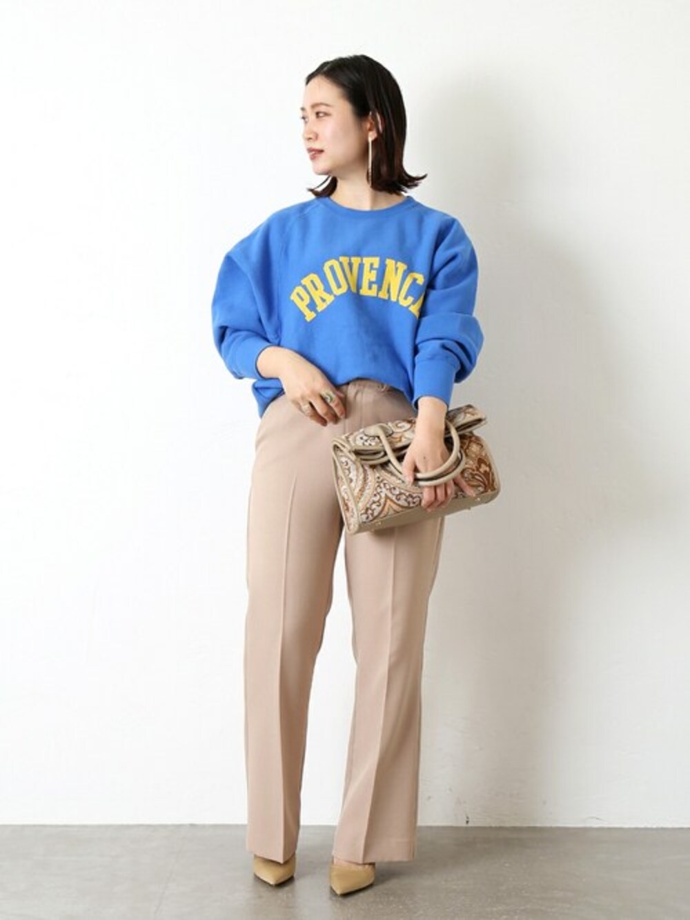 春まで着たいスウェット 爽やかなブルーは、ホワイトやベージュのベーシックカラーと相性抜群。トップスが主役のスウェットコーデに◎短めの丈感なので、ハイウエストのボトムスにタックインもしやすいデザイン。身幅や袖にはボリュームもあるので、上半身に重心をおいたバランスが作りやすい一着です! 【カレッジロゴスウェットスウェット2】 ----- 着心地 ----- サラッとドライな肌心地で、春先に向けて着やすい素材感でした。厚手すぎないスウェット生地なので、アウターも羽織りやすかったです。 ----- サイズ感 ----- 裾に、キュッとしっかりめのリブが入り、そのまま着るだけでメリハリのある着こなしになるサイズ感だと思いました◎身幅や腕まわりにはゆとりがあり、丈は少し短めです。 【セットアップ センタープレスパンツ】 ----- 着心地 ----- なめらかな素材感で、着心地の良い生地。 サラッとしているので肌心地が良いです。 オールシーズン着まわしの出来る素材感なので、何かと重宝しそうです。 ----- サイズ感 ----- 低身長なので、やや長めの丈感でしたが、ヒールと合わせると程よく履けました。丈直ししてもデザインが崩れすぎないので、私の身長ではお直しもアリです◎ウエストが後ろゴムになっているので、窮屈感なく、ゆるすぎず、程よく履けるサイズ感でした。 *** 着用スタッフ情報 *** 身長:153cm 体型:普通 肌:ブルべ/冬 骨格:ウェーブ 普段サイズ:S~M(36~38) 着用サイズ:全て/フリーサイズ