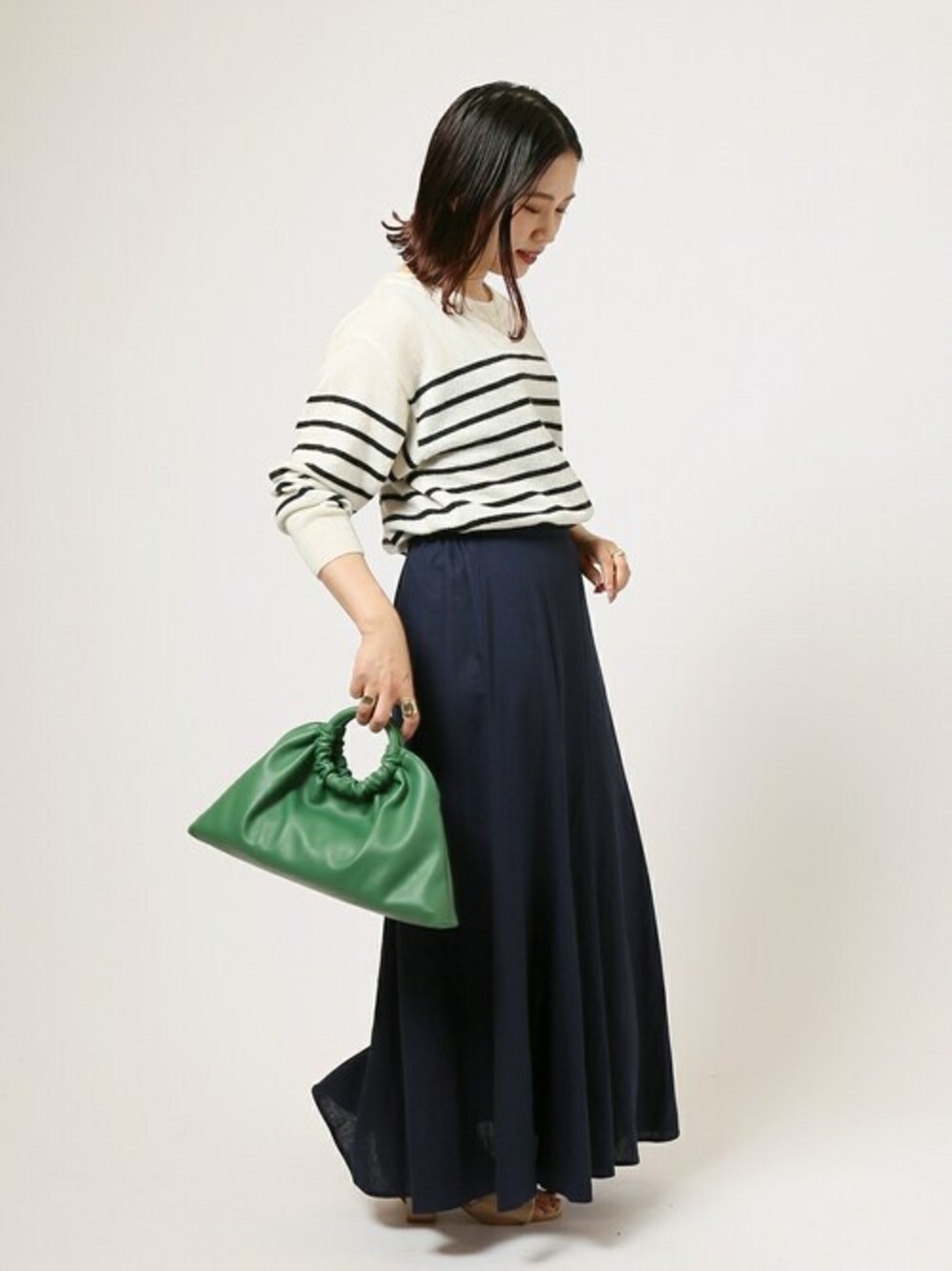 軽い素材感で、ラフに着こなせるボーダーニット。ネイビーのスカートと合わせて、マリンな雰囲気を大人っぽく着こなしてみました。春に向けて着たくなるボーダー柄ですが、まだまだ寒いこの時期には嬉しいウール混の素材。身幅に余裕がありつつも、ゆるっとなりすぎない裾のリブがしっかりしているのでコンパクトに上半身をまとめやすい一着。薄手のニットなので、ボトムスにインしてもモコモコになりにくいのも嬉しいところでした◎ 【パネルボーダーニットプルオーバー】 ----- 着心地 ----- 軽い質感で、春先まで着られるサラッとした着心地でした。薄手の素材感なので、アウターの下にも着やすく、ボリュームを拾いにくいアイテムでした。 ----- サイズ感 ----- 腰にかかる丈感ですが、全体的に大きすぎないので、ゆとりがありつつもシルエットは大きく見えないサイズ感でした◎ 【L/R マーメイドフレアスカート】 ----- 着心地 ----- ドライなリネン混素材で春夏の肌に気持ちい素材感です。 ----- サイズ感 ----- ウエストがゴムなので、窮屈感なく履き心地楽なサイズ感。低身長な私でも、長すぎずちょうど良いロング丈でした。骨格ウェーブで腰まわりにボリュームがある体型なので、マーメイドシルエットは物を選ぶのですが、こちらのデザインは腰が張りにくく丁度良かったです。余裕もあり、動きやすいです。 *** 着用スタッフ情報 *** 身長:153cm 体型:普通 肌:ブルべ/冬 骨格:ウェーブ 普段サイズ:S~M(36~38) 着用サイズ:全て/フリーサイズ