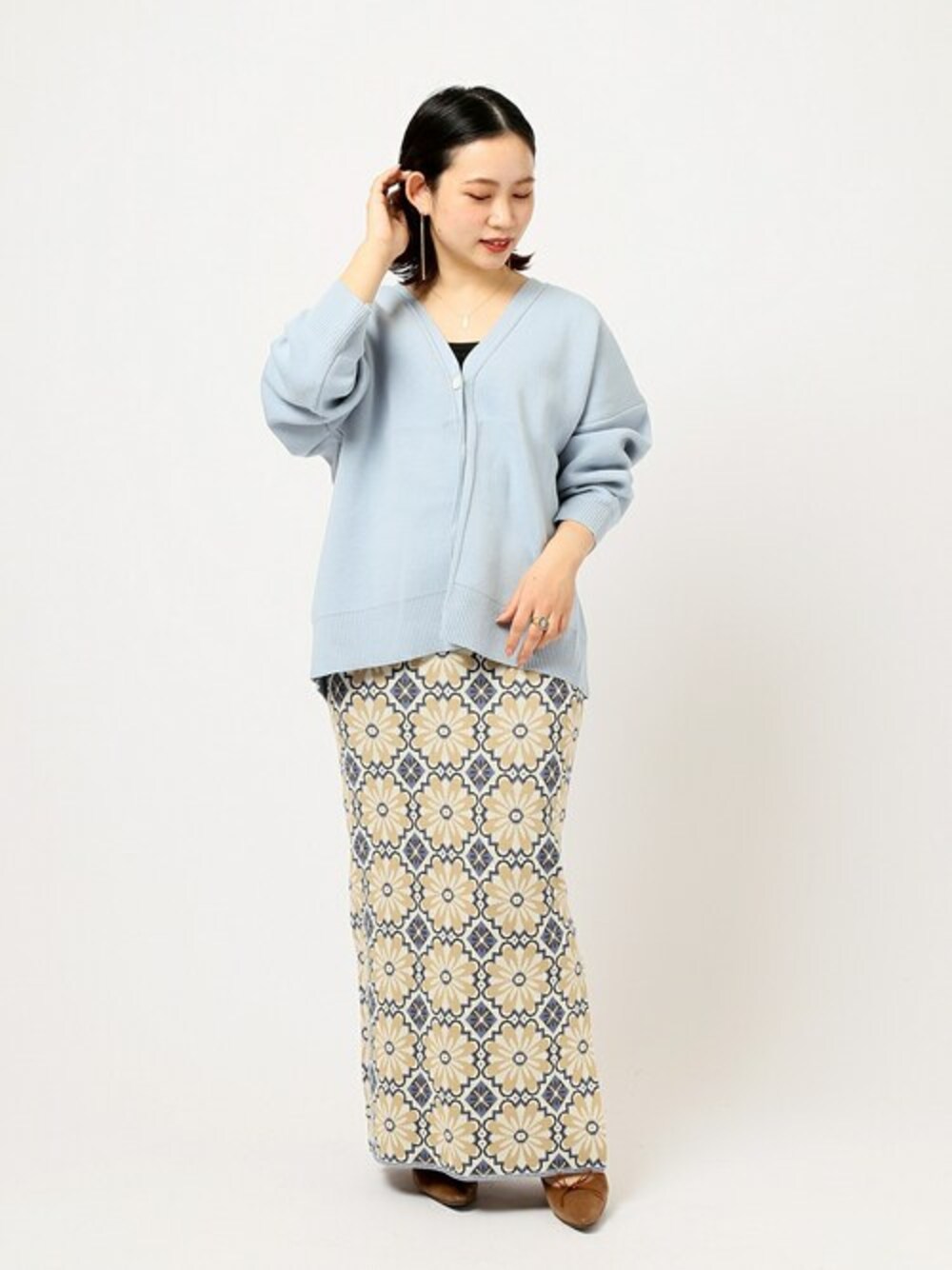 トップスとしても、羽織としても。 程よいオーバーサイズのニットカーデは、春先にも着やすい軽い素材感の一着。今回はトップスとして、タイトスカートと合わせて春らしく◎もちろん羽織としても優秀で、ゆるっと着こなせるので中にカットソーなど着てもボリューミーになりにくいのでオススメです。爽やかなブルーは、薄めな色味なのでこれからの季節に向けてぴったりな一着・・♩ 【WジャガードVカーディガン】 ----- 着心地 ----- ジャガードの素材感ですが、厚すぎず、しっかりとしている中でも動きやすい軽やかさのある素材感です。重たくないので、着心地の良い一着。ヒップを隠す丈感があり、体型カバーにも◎ ----- サイズ感 ----- ゆったり着られる余裕のあるサイズ感で、襟元にVラインがキレイに出ます。余裕があるので、中にロンTや、薄手のニットなどをインしたりするのもオススメです。 【ダブルジャガード柄ニットスカート】 ----- 着心地 ----- 肌触りの良い、毛羽立ちが少ないニットスカート。春のコーデに合わせやすい、軽いジャガードの素材感です。 ----- サイズ感 ----- タイトなシルエットですが、伸縮性抜群で動きやすいサイズ感です。ウエストのゴムは広めでしっかりしているので、ズレにくくぴったり留まってくれます。私の身長で、フラットシューズ合わせだと、やや長めですが低めのヒールやウエストを一折するだけでちょうど良くなるので、コーデに合わせて対応出来そうです◎ *** 着用スタッフ情報 *** 身長:153cm 体型:普通 肌:ブルべ/冬 骨格:ウェーブ 普段サイズ:S~M(36~38) 着用サイズ:全て/フリーサイズ