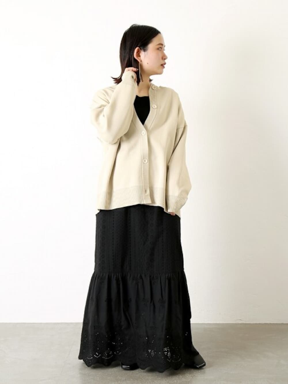 春先にも、オススメのニットカーデ。 起毛感が少なく、スムースな素材感が春先にも着たくなるニットカーデ。店舗でもオンラインでも大人気で、新色が追加になりました◎クルーネックのカーディガンですが、ボタンを途中までの開け方にすればVネックのようにも♩お色味「ナチュラル」は、生成りのような薄いベージュのような色味で肌なじみが良かったです。トップスとしても羽織としても活躍してくれるので、暖かくなるまでたくさん着ようと思います。ヒップにかかる丈感があるので、さりげない体型カバーにも嬉しい一着♩ 【クルーネックダンボールカーディガン】 ----- 着心地 ----- チクチク感が気になりにくいニットで、着心地の良い素材感です。 軽い素材感なので、エアリーな着心地。目が詰まっているので、毛玉が出来てもケアしやすそうなところも◎ ----- サイズ感 ----- 身回りはゆったり余裕のあるサイズですが、丈が長すぎないので程よい立体感を楽しめるサイズ感です。 【レースパッチワークティアードスカート】 ----- 着心地 ----- 軽い着心地で、動きやすい素材感です。 広がりすぎないのにタイトすぎないので、足さばきも良かったです。 ----- サイズ感 ----- 私の身長で、フラットシューズだとくるぶしが隠れるくらいのロング丈です。裾は擦りませんでした◎ウエストがゴムなので楽ちんな履き心地です。膝下まで裏地があるので、レース素材でもインナーの透けが気になりにくかったです。 *** 着用スタッフ情報 *** 身長:153cm 体型:普通 肌:ブルべ/冬 骨格:ウェーブ 普段サイズ:S~M(36~38) 着用サイズ:全て/フリーサイズ