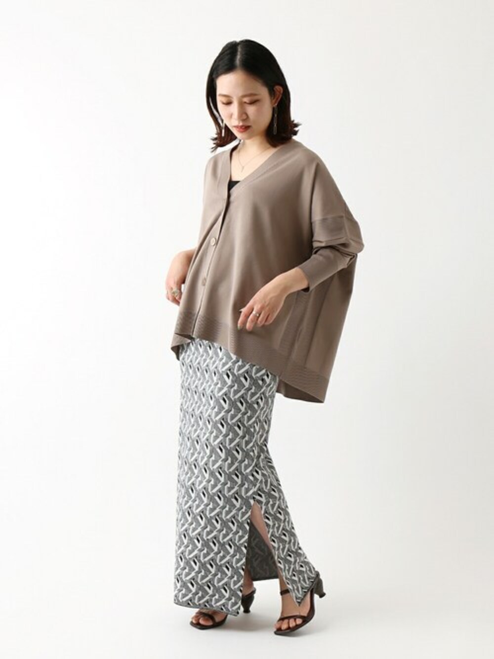 肌心地、抜群のカーディガン。 ボックス型のシルエットが今っぽくて、タイトスカートと合わせると身まわりに余裕が出来て細見えさせてくれそうな◎スムースな素材感で、春夏の季節にぴったり。キレイめにもカジュアルにも着まわせるシンプルなデザインなので、これから重宝しそうな予感・・♩ 【ソフトポリニットVカーディガン】 ----- 着心地 ----- サラッと肌心地の良い、着心地。 軽いタッチで着られるニットカーデです。春はトップスとしても活躍してくれ、夏にはUV・冷房対策にも◎ ----- サイズ感 ----- ゆとりのあるオーバーサイズで、ラフに着こなせる落ち感があります。程よく薄手の素材感なので、ボックスシルエットでも大きく見えずに着られるサイズ感です◎ 【ダブルジャガード柄ニットスカート】 ----- 着心地 ----- 肌触りの良い、毛羽立ちが少ないニットスカート。春のコーデに合わせやすい、軽いジャガードの素材感です。 ----- サイズ感 ----- タイトなシルエットですが、伸縮性抜群で動きやすいサイズ感です。ウエストのゴムは広めでしっかりしているので、ズレにくくぴったり留まってくれます。私の身長で、フラットシューズ合わせだと、やや長めですが低めのヒールやウエストを一折するだけでちょうど良くなるので、コーデに合わせて対応出来そうです◎ *** 着用スタッフ情報 *** 身長:153cm 体型:普通 肌:ブルべ/冬 骨格:ウェーブ 普段サイズ:S~M(36~38) 着用サイズ:全て/フリーサイズ