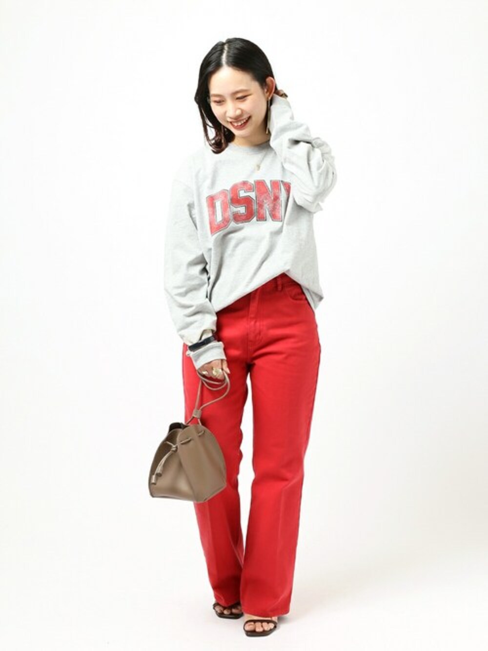 ゆるっとカットソーをカジュアルに。 程よくフレアデザインなデニムと、ゆるっと着られるXlサイズが嬉しいロンTをカジュアルに合わせたコーデ。メンズライクなオーバーサイズも可愛いけれど、低身長な私は大きすぎると服に着られてしまう懸念が。。こちらのロンTは“程よく”ゆるっと着られるので大きすぎず、バランス感が取りやすかったです。今回は、ロゴのレッドとパンツを合わせる事で、まとまり感を◎アメリカンなパキッとしたレッドは、ベーシックカラーと相性が良いので、簡単に差し色コーデが出来る一着。シルエットがキレイなデニムなので、毎年使えるアイテムになってくれそうです・・♪ 【NYC LOGO TEE by ROCK STANLEY】 ----- 着心地 ----- 動きやすい着心地。 サラッと肌触りも良いです。袖口はリブ仕様なので、たくし上げた時に留まってくれるのも。 ----- サイズ感 ----- 柔らかい素材感で張り感も少なく、メンズっぽくなりすぎないサイズ感です。あえてXLで余裕をしっかり作って着こなすのが好みです◎ 【Natural Friendly Denim フレアパンツ】 ----- 着心地 ----- 硬すぎず柔らかすぎずの程よい素材感で、動きやすい着心地でした。オールシーズン着まわせるアイテムなので、綺麗なフレアデザインのデニムは一本あると重宝しそうです。 ----- サイズ感 ----- Mサイズを着用、腰回りは程よく少しゆとりあり、丈は少し長めでした。フラットシューズだと床を擦ってしまいましたが、ヒールのある靴なら◎私の身長体型ではSサイズが良さそうでした。 *** 着用スタッフ情報 *** 身長:153cm 体型:普通 肌:ブルべ/冬 骨格:ウェーブ 普段サイズ:S~M(36~38) 着用サイズ:トップス/XLサイズ、パンツ/Mサイズ