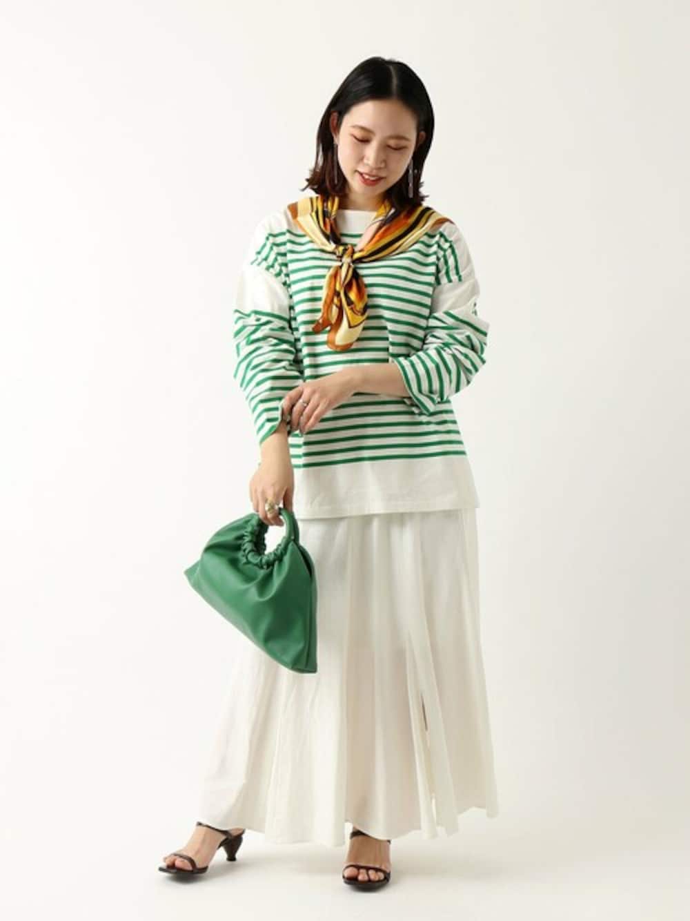 トレンドカラーで今っぽい雰囲気に。 目を惹くグリーンは、今年の春夏気になるカラー。 いつものボーダーも、差し色使いで今年らしい雰囲気で着こなせる一着に♩ポイントになるカラーには、バーシックな主張のない色味が合わせやすさ抜群。いつもの白黒やベージュ、デニムのブルーなども可愛いです◎今回は、真っ白なスカートと合わせてクリーンな印象にしてみました。ボックスシルエットで身幅に余裕があるので、腰回りがスッキリするマーメイドシルエットとも相性抜群です♩ 【バスクパネル ボーダープルオーバー】 ----- 着心地 ----- しっかりめなコットン素材で、透け感がないので一枚でも安心して着られます。程よくハリ感があり、ドライな着心地です。 ----- サイズ感 ----- 余裕をもって着られるサイズ感。身幅にも腕まわりにも余裕があるので、中にシャツをインしたりしても◎ 【L/R マーメイドフレアスカート】 ----- 着心地 ----- ドライなリネン混素材で春夏の肌に気持ちい素材感です。 ----- サイズ感 ----- ウエストがゴムなので、窮屈感なく履き心地楽なサイズ感。低身長な私でも、長すぎずちょうど良いロング丈でした。骨格ウェーブで腰まわりにボリュームがある体型なので、マーメイドシルエットは物を選ぶのですが、こちらのデザインは腰が張りにくく丁度良かったです。余裕もあり、動きやすいです。 *** 着用スタッフ情報 *** 身長:153cm 体型:普通 肌:ブルべ/冬 骨格:ウェーブ 普段サイズ:S~M(36~38) 着用サイズ:全て/フリーサイズ