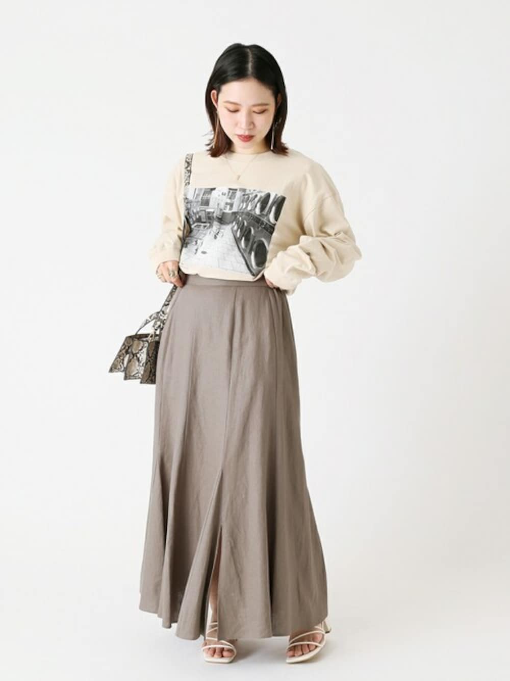 春に着たい、フォトT。 ゴドリスのフォトTは、モノクロプリントなので主張が強すぎず大人の取り入れやすいカジュアルアイテムに。コインランドリーの日常的な風景は、癖が強くないのでボトムスを選びにくく着まわしやすい一着に◎今回は、マーメイドシルエットのスカートで女性らしさをプラスしてみました。肌なじみの良いベージュカラーは、濃すぎず薄すぎず程よい色味なのも、この春着こなしの幅が広がりそうな予感です・・♩ 【GODLIS/ゴドリス PHOTO TEE by ROCK STANLEY】 ----- 着心地 ----- 動きやすい着心地。 サラッと肌触りも良いです。袖口はリブ仕様なので、たくし上げた時に留まってくれるのも。 ----- サイズ感 ----- 柔らかい素材感で張り感も少なく、メンズっぽくなりすぎないサイズ感です。あえてXLで余裕をしっかり作って着こなすのが好みです◎ 【L/R マーメイドフレアスカート】 ----- 着心地 ----- ドライなリネン混素材で春夏の肌に気持ちい素材感です。 ----- サイズ感 ----- ウエストがゴムなので、窮屈感なく履き心地楽なサイズ感。低身長な私でも、長すぎずちょうど良いロング丈でした。骨格ウェーブで腰まわりにボリュームがある体型なので、マーメイドシルエットは物を選ぶのですが、こちらのデザインは腰が張りにくく丁度良かったです。余裕もあり、動きやすいです。 *** 着用スタッフ情報 *** 身長:153cm 体型:普通 肌:ブルべ/冬 骨格:ウェーブ 普段サイズ:S~M(36~38) 着用サイズ:トップス/XLサイズ、スカート/フリーサイズ