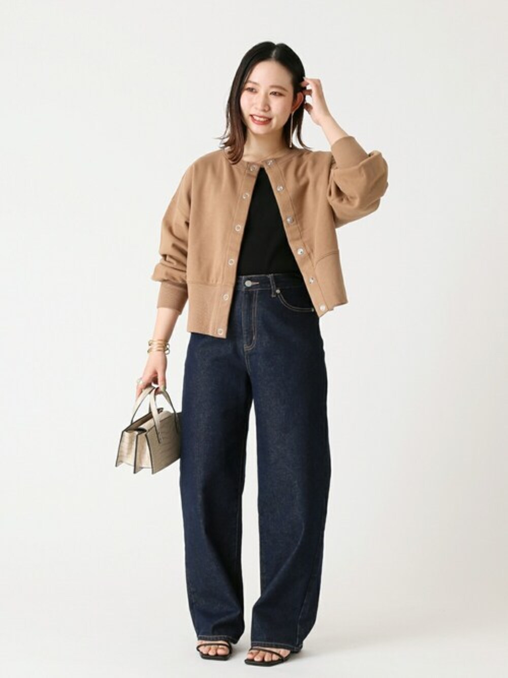 大活躍確定のカットソー 前後どちらを前にしても、ボタンを閉じても開けても着られる着まわし力抜群のトップス。低身長にバランスが取りやすいショート丈なのも、体型に合う一着でした!ハイウエストのボトムスに合わせるだけでもメリハリのあるバランスが作れるので、この春重宝しそうなアイテム第一位です。パチッと留められるスナップボタンなのも、デザインのポイントに・・♩ 【2way リングドット2】 ----- 着心地 ----- 裏毛の肌心地が良い素材感で、着心地が良いです。裾のリブはしっかり入っているので、上半身をコンパクトに見せてくれるような・・♪ ----- サイズ感 ----- ショート丈で、低身長な自分にもバランスとメリハリがつけやすいサイズ感。袖周りには余裕があり、たくし上げるとボリューム感のある袖デザインになるのも良かったです。 【Natural Friendly Denim バギーパンツ】 ----- 着心地 ----- 硬すぎず柔らかすぎず、程よいハリ感があります。だぶっとしたバギーのシルエットがキレイに出ます。動きやすく、硬すぎないので屈伸もしやすかったです。デニムですが、使い込んで馴染ませる間もなく、既に着心地の良いアイテムでした。 ----- サイズ感 ----- Mサイズを着用、腰回りは程よく少しゆとりあり、丈は少し長めでした。フラットシューズだと床を擦ってしまいましたが、ヒールのパンプスを一緒に着用した時、床を擦らないくらいの丈感でしたが、ベーシックなデニムで何にでも合わせたいので、私の身長体型ではSサイズが良さそうでした◎ *** 着用スタッフ情報 *** 身長:153cm 体型:普通 肌:ブルべ/冬 骨格:ウェーブ 普段サイズ:S~M(36~38) 着用サイズ:トップス/フリー、パンツ/M