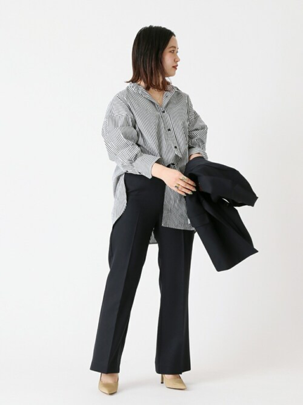 キレイめパンツの、着回しコーデ。 シンプルでシルエットのキレイなパンツは、オールシーズン重宝するコーデのベースアイテムにもなってくれる、強い味方。今回は、オフィスカジュアルにも着られるベーシックなシャツと合わせて、キレイめなコーデにしてみました。センタープレスのラインがキレイなので、あえてスウェットなどカジュアルなアイテムに合わせるのもオススメです♩ 【 スタンダードニュアンスシャツ 】 ----- 着心地 ----- 着心地の良い、サラッとした素材感のシャツです。 秋から春までロングシーズン着まわして頂ける素材で、ビッグシルエットですが、ニットの下にレイヤードをしてもゴワつきにくかったです。 ----- サイズ感 ----- ゆるっとラフに着こなせる、ビッグシルエットのサイズ感。ヒップ下まで丈感があるので、体型カバーにも嬉しいポイントでした。 【セットアップ センタープレスパンツ】 ----- 着心地 ----- なめらかな素材感で、着心地の良い生地。 サラッとしているので肌心地が良いです。 オールシーズン着まわしの出来る素材感なので、何かと重宝しそうです。 ----- サイズ感 ----- 低身長なので、やや長めの丈感でしたが、ヒールと合わせると程よく履けました。丈直ししてもデザインが崩れすぎないので、私の身長ではお直しもアリです◎ウエストが後ろゴムになっているので、窮屈感なく、ゆるすぎず、程よく履けるサイズ感でした。 *** 着用スタッフ情報 *** 身長:153cm 体型:普通 肌:ブルべ/冬 骨格:ウェーブ 普段サイズ:S~M(36~38) 着用サイズ:全て/フリーサイズ