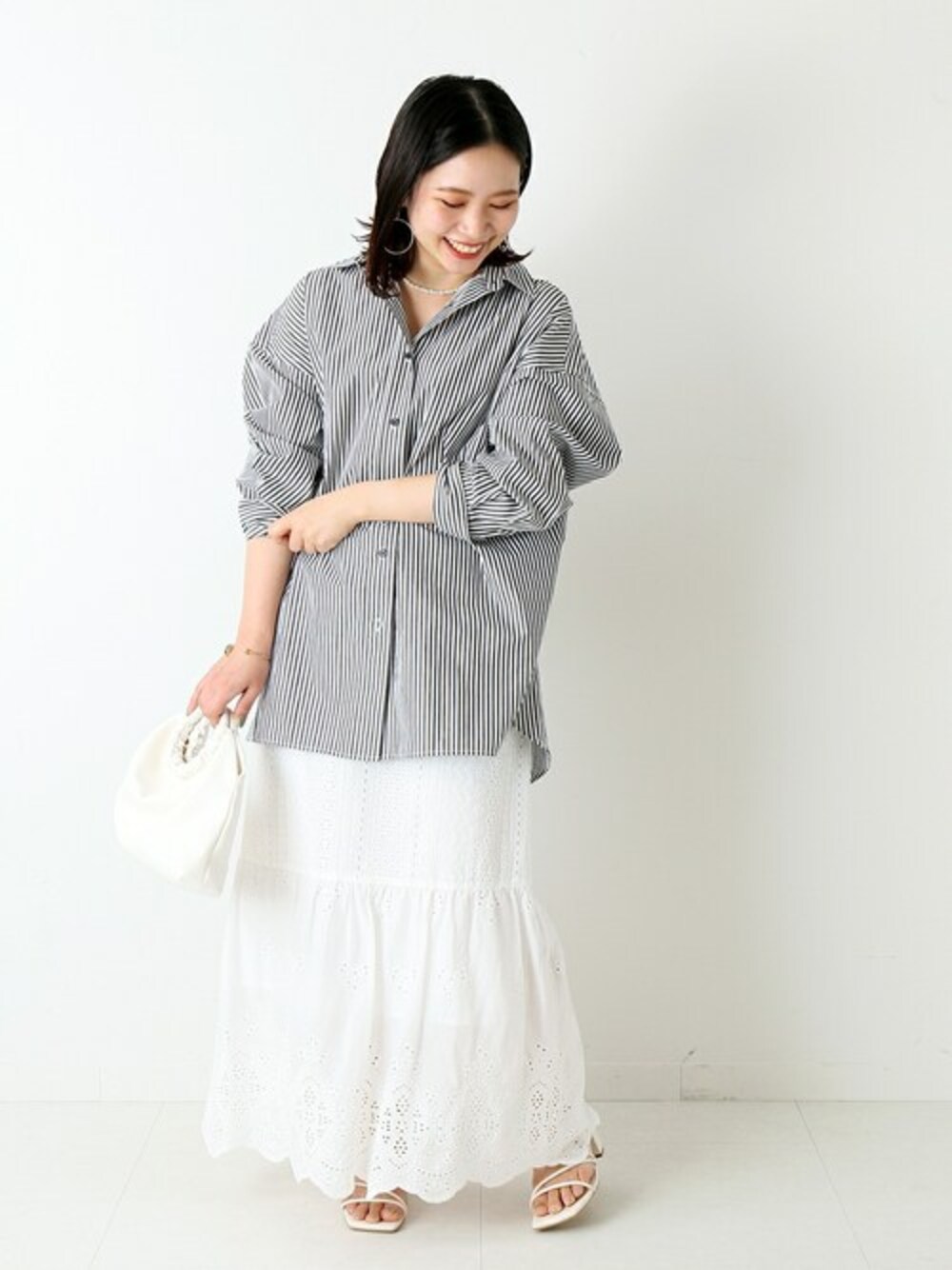 レース×ストライプ 柄×柄で合わせたいけど、組み合わせが悩む・・という時にレース生地が活躍◎総柄の雰囲気もありつつ、他の柄とも相性良く馴染みやすい一着に。トレンドのストライプは、ラインが細いのでカジュアルになりすぎず、大人っぽく着こなせるアイテム。明るいトーンで合わせて、春に着たい軽やかな雰囲気にしてみました♩ 【 スタンダードニュアンスシャツ 】 ----- 着心地 ----- 着心地の良い、サラッとした素材感のシャツです。 秋から春までロングシーズン着まわして頂ける素材で、ビッグシルエットですが、ニットの下にレイヤードをしてもゴワつきにくかったです。 ----- サイズ感 ----- ゆるっとラフに着こなせる、ビッグシルエットのサイズ感。ヒップ下まで丈感があるので、体型カバーにも嬉しいポイントでした。 【レースパッチワークティアードスカート】 ----- 着心地 ----- 軽い着心地で、動きやすい素材感です。 広がりすぎないのにタイトすぎないので、足さばきも良かったです。 ----- サイズ感 ----- 私の身長で、フラットシューズだとくるぶしが隠れるくらいのロング丈です。裾は擦りませんでした◎ウエストがゴムなので楽ちんな履き心地です。膝下まで裏地があるので、レース素材でもインナーの透けが気になりにくかったです。 *** 着用スタッフ情報 *** 身長:153cm 体型:普通 肌:ブルべ/冬 骨格:ウェーブ 普段サイズ:S~M(36~38) 着用サイズ:全て/フリー
