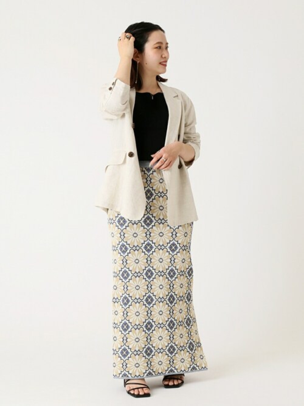 季節感を出すなら、リネン素材で。 春夏の雰囲気抜群のリネン素材。春先のまだ羽織がいる頃にも、ジャケットなら温度調節もしやすいアイテムに。レトロな柄がトレンドの花柄スカートを合わせて、カジュアルダウンしてみました。ベージュ系の色味でまとめる事で、花柄も程よく大人っぽく◎骨格ウェーブな体型なので、タイトスカートは腰まわりのシルエットを拾うのが気になるのですが、体型カバーしてくれるジャケットと一緒なら、気にならずに着られるのも嬉しいところ・・♩ 【LelinZephyrリネンJKT】 ----- 着心地 ----- 通気性の良いリネン素材で、春から夏にかけて重宝しそうなライトな素材感。 ----- サイズ感 ----- 程よくゆとりがありますが、大きすぎないサイズ感なのでちょうど良かったです。私の身長でヒップにかかるくらいだったので、長すぎず短すぎず、隠したいところは隠してくれる丈感でした◎ 【ダブルジャガード柄ニットスカート】 ----- 着心地 ----- 肌触りの良い、毛羽立ちが少ないニットスカート。春のコーデに合わせやすい、軽いジャガードの素材感です。 ----- サイズ感 ----- タイトなシルエットですが、伸縮性抜群で動きやすいサイズ感です。ウエストのゴムは広めでしっかりしているので、ズレにくくぴったり留まってくれます。私の身長で、フラットシューズ合わせだと、やや長めですが低めのヒールやウエストを一折するだけでちょうど良くなるので、コーデに合わせて対応出来そうです◎ *** 着用スタッフ情報 *** 身長:153cm 体型:普通 肌:ブルべ/冬 骨格:ウェーブ 普段サイズ:S~M(36~38) 着用サイズ:ジャケット/M、その他全て/フリー