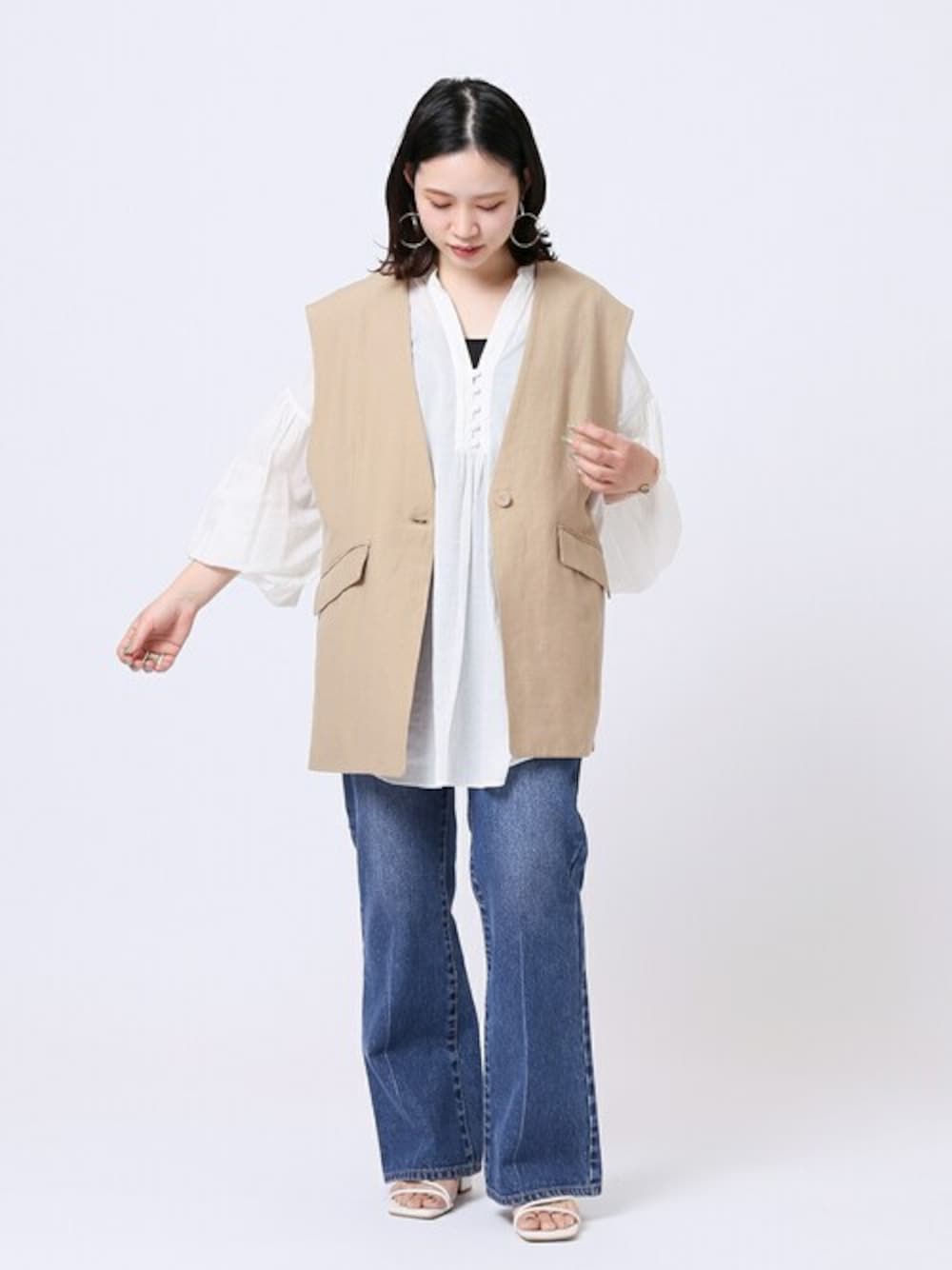気軽に着たい、春のカジュアルコーデ。 軽い素材感のブラウスは、それだけで季節感満点の一着。ベストとレイヤードして、カジュアルな着こなしにしてみました。中に着るアイテム次第で、様々なアイテムとレイヤードが楽しめるので、あるとコーデの着回しに活躍必至になってくれそう・・♩ヒップを隠す丈感も、深めのVラインもとても好みでした◎ 【カラーレスジレ】 ----- 着心地 ----- ドライな質感で、肌触りの良いサラッとした着心地。 オールシーズン着られるような軽い素材感なので、下に着るアイテム次第でコーデの幅を広く楽しめそうです。 ----- サイズ感 ----- ヒップが隠れる丈感で、ゆとりのあるサイズ感。アームホールも広めなので、中に袖コンシャスなブラウスなどを着てもキツくなりにくく、着やすいサイズ感でした。 【フロントボタンシャンブレーブラウス】 ----- 着心地 ----- ふわっと風の入る、肌心地の良い軽い着心地です。薄手の素材感なので、春から夏まで楽しめそうなエアリーな生地です。 ----- サイズ感 ----- ゆるっとオーバーサイズで、身幅も袖幅もゆとりがあるので、ふんわりと着られるサイズ感です。 【Natural Friendly Denim フレアパンツ】 ----- 着心地 ----- 硬すぎず柔らかすぎずの程よい素材感で、動きやすい着心地でした。オールシーズン着まわせるアイテムなので、綺麗なフレアデザインのデニムは一本あると重宝しそうです。 ----- サイズ感 ----- Mサイズを着用、腰回りは程よく少しゆとりあり、丈は少し長めでした。フラットシューズだと床を擦ってしまいましたが、ヒールのある靴なら◎私の身長体型ではSサイズが良さそうでした。 *** 着用スタッフ情報 *** 身長:153cm 体型:普通 肌:ブルべ/冬 骨格:ウェーブ 普段サイズ:S~M(36~38) 着用サイズ:パンツ/Mサイズ、トップス/フリーサイズ