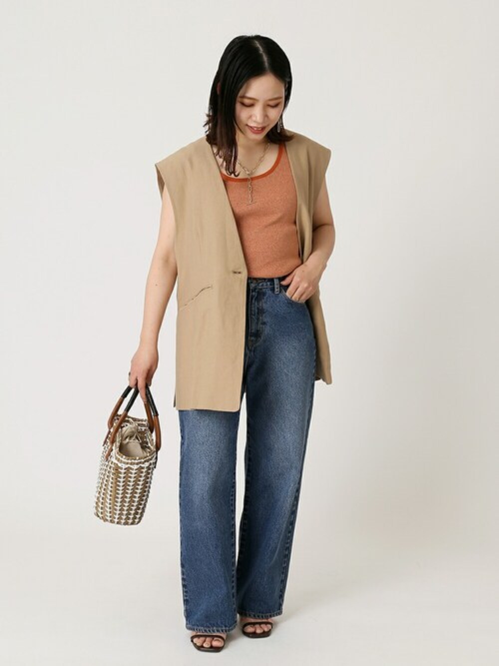 オールシーズン着たくなる、ジレ。 軽い素材感で、中に着るもの次第で着こなしの幅が無限に広がるジレ。簡単に今っぽいレイヤードコーデが出来るので、何かと重宝しています。今回のアイテムは、シルエットがとっても好みの一着でした。ヒップを隠す丈感に、深めにVラインが出来るデザイン、アームホールも広いので、袖コンシャスなブラウスなどを中に着ても!◎ ノースリーブやタンクトップで着た時は、肩の丸みが出ると子供っぽくなるので気になっていたのですが、こちらは隠してくれる幅の広いデザインが嬉しいポイントでした◎ 【カラーレスジレ】 ----- 着心地 ----- ドライな質感で、肌触りの良いサラッとした着心地。 オールシーズン着られるような軽い素材感なので、下に着るアイテム次第でコーデの幅を広く楽しめそうです。 ----- サイズ感 ----- ヒップが隠れる丈感で、ゆとりのあるサイズ感。アームホールも広めなので、中に袖コンシャスなブラウスなどを着てもキツくなりにくく、着やすいサイズ感でした。 【Natural Friendly Denim バギーパンツ】 ----- 着心地 ----- 硬すぎず柔らかすぎず、程よいハリ感があります。だぶっとしたバギーのシルエットがキレイに出ます。動きやすく、硬すぎないので屈伸もしやすかったです。デニムですが、使い込んで馴染ませる間もなく、既に着心地の良いアイテムでした。 ----- サイズ感 ----- Mサイズを着用、腰回りは程よく少しゆとりあり、丈は少し長めでした。フラットシューズだと床を擦ってしまいましたが、ヒールのパンプスを一緒に着用した時、床を擦らないくらいの丈感でしたが、ベーシックなデニムで何にでも合わせたいので、私の身長体型ではSサイズが良さそうでした◎ *** 着用スタッフ情報 *** 身長:153cm 体型:普通 肌:ブルべ/冬 骨格:ウェーブ 普段サイズ:S~M(36~38) 着用サイズ:パンツ/Mサイズ、その他/フリーサイズ