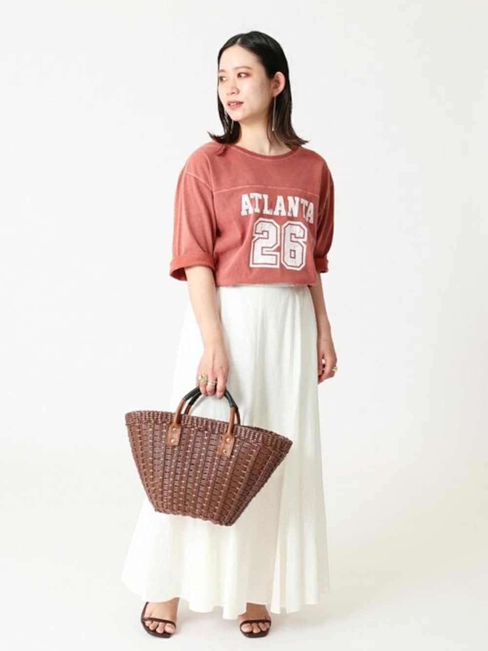 春夏のカジュアルコーデ くたっとした質感が着心地の良いTシャツ。オレンジは、赤寄りの色味です。擦れた色味がこなれた雰囲気にしてくれるので、シンプルなボトムスと合わせるだけでも◎今回はプリントのホワイトとボトムスの色味を合わせて、まとまり感のあるカジュアルコーデにしてみました。マーメイドスカートは、腰回りがタイトすぎないので、骨格ウェーブな私でもスッキリ着られるのが嬉しいところ。 【College football tee】 ----- 着心地 ----- くたっとした肌なじみの良い、古着っぽい質感。柔らかく、着心地が良いです。 ----- サイズ感 ----- ゆとりのあるサイズ感で、余裕をもって着られました。袖丈が長めで、肘下なのも◎そのままでもメンズライクで可愛いですし、袖を折っても短くなりすぎないのでちょうど良いサイズ感でした。 【L/R マーメイドフレアスカート】 ----- 着心地 ----- ドライなリネン混素材で春夏の肌に気持ちい素材感です。 ----- サイズ感 ----- ウエストがゴムなので、窮屈感なく履き心地楽なサイズ感。低身長な私でも、長すぎずちょうど良いロング丈でした。骨格ウェーブで腰まわりにボリュームがある体型なので、マーメイドシルエットは物を選ぶのですが、こちらのデザインは腰が張りにくく丁度良かったです。余裕もあり、動きやすいです。 *** 着用スタッフ情報 *** 身長:153cm 体型:普通 肌:ブルべ/冬 骨格:ウェーブ 普段サイズ:S~M(36~38) 着用サイズ:全て/フリー Instagram:_asako108_