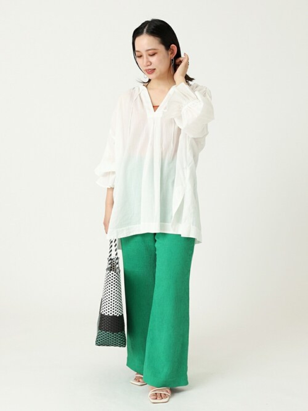 春夏に着たい、主役ブラウス。 薄手の素材なら、長袖でも春夏着心地の良い素材感に。むしろ、UV対策にもなってくれるので嬉しい一着。やや透け感のある生地なので重たく見えず、キャミなどをほんのり透けさせて、抜け感のあるラフな雰囲気に・・◎袖をたくし上げるとキャンディースリーブのデザインが、くしゅっとなってボリューム感が出るのも、とても可愛いです。パンツにもスカートにも合わせやすいので、これからのシーズン幅広いコーデに活躍してくれそうです♩ 【キャンディースリーブスキッパーシャツ】 ----- 着心地 ----- 軽くて、ふんわりとした風の入る着心地。春夏の暑い気温に合わせやすい、エアリーな着心地です。 ----- サイズ感 ----- 余裕のあるサイズ感で、体型を拾わずに着られます。生地も薄手なので、ボトムスにインしてもボリューム感が出ずに着られるのも、嬉しいところでした。 【L/Rクレープイージーパンツ】 ----- 着心地 ----- 裾の方まで裏地があるので、薄い色味でも透け感が気にならないのが嬉しいところでしした。柔らかく、楊柳のような凸凹の生地感がドライな肌心地で、着心地も◎ ----- サイズ感 ----- ウエストはドロストで絞れるようになっており、一度結んでウエストにサイズ感を決めておけば、サイドジップだけで着脱も出来るので着やすかったです◎低身長ですが、5cmくらいのヒールで合わせてちょうど良かったです。 *** 着用スタッフ情報 *** 身長:153cm 体型:普通 肌:ブルべ/冬 骨格:ウェーブ 普段サイズ:S~M(36~38) 着用サイズ:全て/フリー