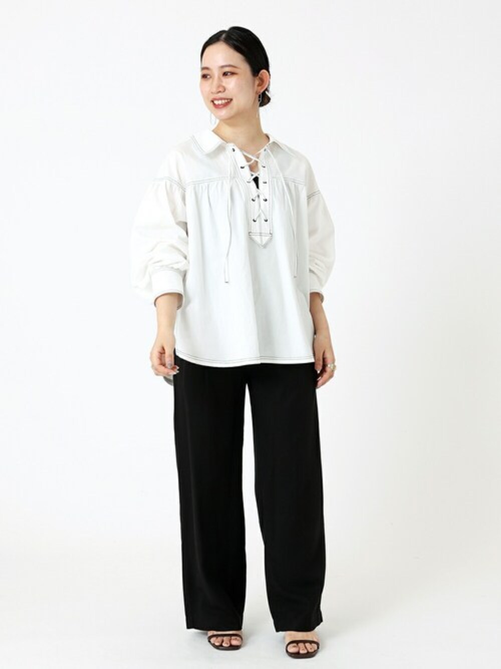 主役ブラウスを、一枚で着られる春。 アウターなしで外出できる暖かい気温に最適な、それだけでコーデのポイントになってくれるブラウスを、シックにモノトーンで合わせてみました。そのままバサっと着るだけで、立体感の出る素材感がキレイにシルエットを作ってくれ、ヒップを隠してくれる長さもあるのでさりげない体型カバーにも◎襟元はレースアップなので、紐の結び方で顔まわりの印象を変えて頂けます♩ 【レースアップブラウス】 ----- 着心地 ----- 軽い着心地で、動きやすいです。襟元もレースアップですが詰まっていないので、ラフに着られる着心地です。 ----- サイズ感 ----- ゆったり着られる余裕のあるサイズ感で、立体的にふんわり着られました。 【リヨセルワイドパンツ】 ----- 着心地 ----- てろん、とした素材感が肌心地の良いパンツ。薄手ですが透けないので、気温の高い日にも着やすい一着。 ----- サイズ感 ----- 長すぎず、ウエストが内側で絞れるので丁度良いサイズ感で着られました。タックインしてもウエストがキレイに見えるので、嬉しいデザインでした◎ *** 着用スタッフ情報 *** 身長:153cm 体型:普通 肌:ブルべ/冬 骨格:ウェーブ 普段サイズ:S~M(36~38) 着用サイズ:全て/フリー Instagram:_asako108_