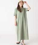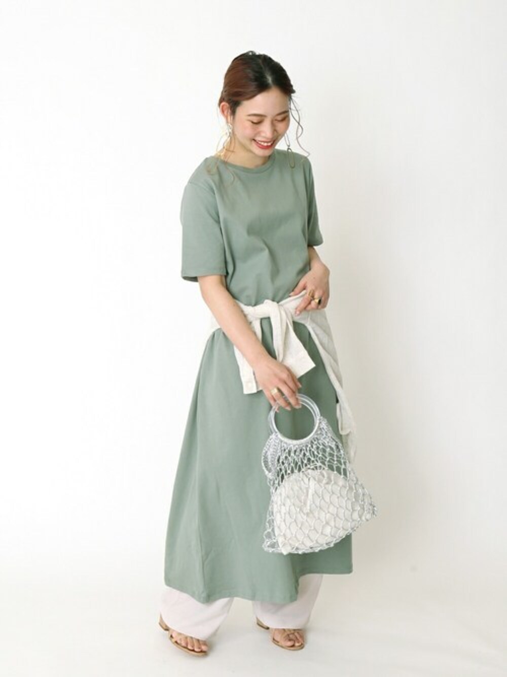 ワンピースを惹き立てる、2つの配色 グリーンのワンピを中心に、少量のホワイトを配色する事でまとまり感のあるバランスコーデに。ニュアンス感のある柔らかなグリーンも、ウエストにポイントを持ってくることで爽やかな中にもメリハリを。裾に向けて広がるフレアデザインなので、ワイドパンツをインしてもボリュームが出ずに着こなせるのも嬉しいポイント◎ 【五分袖 度詰めワンピース】 着心地:サラッと肌に張り付かない素材感が、着心地の良い一枚。薄手でなく、厚手でないちょうど良いカットソー地は透け感がないので、一枚で着こなせるのも嬉しいアイテムです。 サイズ感:ボディラインを拾いにくい程よくゆとりのあるサイズ感。五分袖の袖丈が二の腕を隠してくれるので、上半身をスッキリと、下半身は揺れ感の動きがある絶妙なシルエットです。 【ヴィンテージサテンイージーパンツ】 着心地:細やかなシワ感がヴィンテージライクな素材で、ツルっとした素材が着心地の良い一枚です。 サイズ感:フリーサイズですが、大きすぎずちょうどよく履けました。ウエストが全周ゴムなので、ラクチンな履き心地も嬉しいアイテム。 *** 着用スタッフ情報 *** 身長:153cm 体型:普通 普段サイズ:S~M(36~38) 着用サイズ:全てFREE size