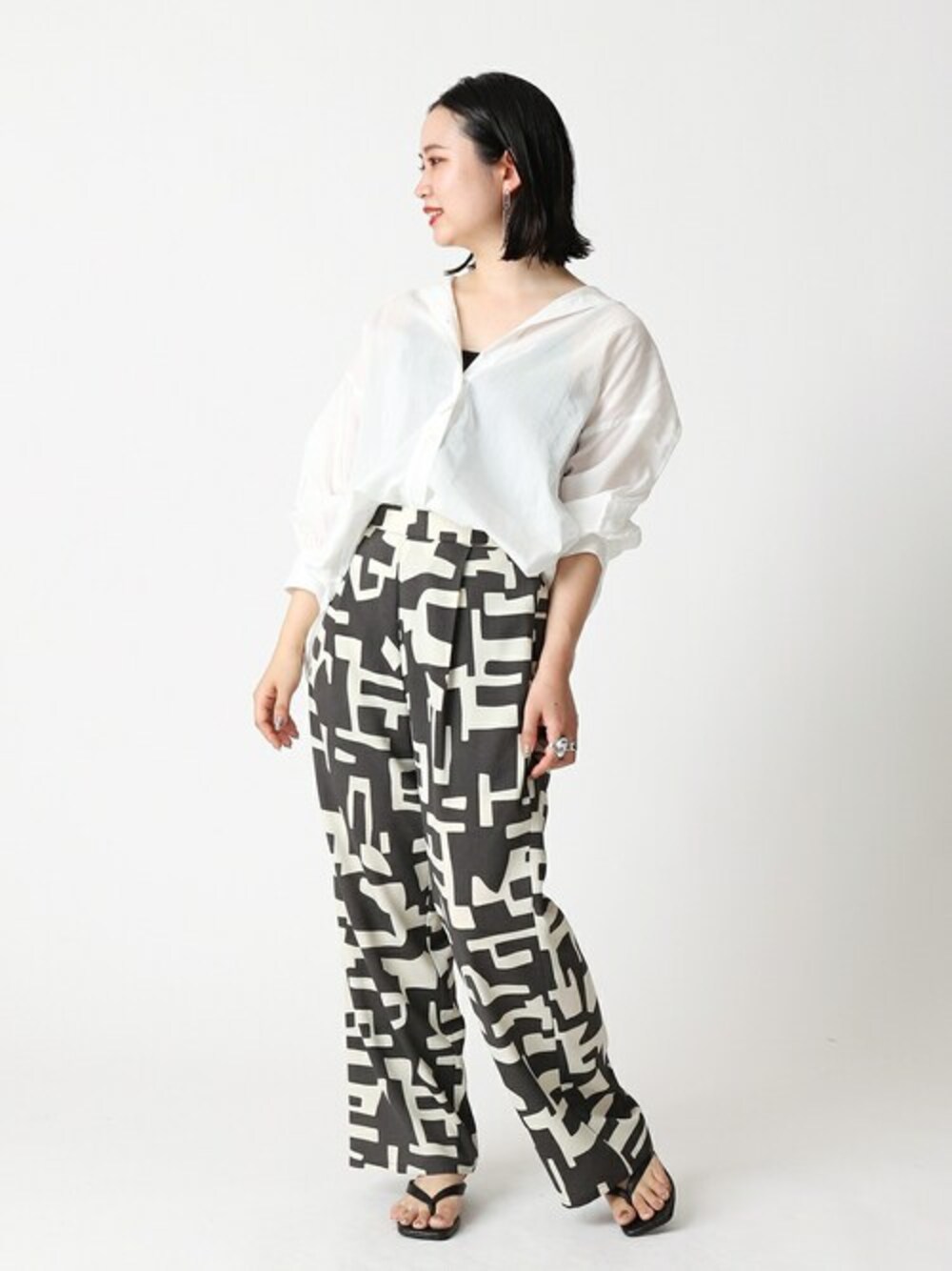 柄物パンツを、大人っぽく。 カジュアルになりがちなアートプリント。シックにモノトーンでまとめれば、大人の着やすいラフさを取り入れられます。白シャツは、程よく透けて透けすぎない、丁度良いラフさのある一着。余裕のあるサイズ感なので、タックインしてウエストでメリハリをつけてみました。万能に使えそうなシンプルさも、着回しの幅が広がるポイントに♩ 【C/Rシアーワイドシャツ】 ----- 着心地 ----- 軽い着心地で、動きやすいです。やや薄手という感じで、透け過ぎない生地なので、透け過ぎたくないけど軽さが欲しいという時にも最適な生地感でした。 ----- サイズ感 ----- ゆるっと着られるサイズ感で、体型を拾わずラフに着られました。 【artモチーフプリントパンツ】 ----- 着心地 ----- 軽いので、動きやすく着心地が良いです。 ----- サイズ感 ----- ゆるっと着られるサイズ感でしたが、ワイドすぎないので、だらしなくならずラフに着られるシルエットでした◎ *** 着用スタッフ情報 *** 年齢:30代前半 身長:153cm 体型:普通 肌:ブルーベース/冬 骨格:ウェーブ 普段サイズ:S~M(36~38) 着用サイズ:全て/フリー Instagram:_asako108_