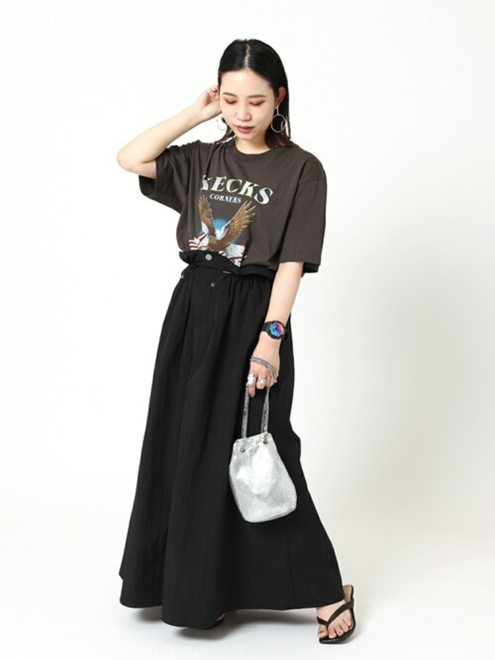秋まで着られる夏のブラック、ワントーンコーデ。 くたっとした古着のような肌なじみの良い質感のTシャツは、墨黒のようなニュアンス感のある色味。シャカシャカ素材で、やや光沢感のあるスカートと合わせて、同じブラックでも素材の違いでバランスをとったコーデにしてみました。 【GOOD ROCK SPEED / ROCK TEE】 ----- 着心地 ----- 軽い着心地で動きやすかったです。やや薄手の素材感なので、ボトムスにインした時にもゴワつきにくく、着やすかったのが嬉しいところでした。 ----- サイズ感 ----- ゆるっと着られる、余裕のあるサイズ感でした。 【ドローコードギャザースカート】 ----- 着心地 ----- シャカシャカとした素材感で、オールシーズン着られそうな透けない素材です。裏地がメッシュ素材なので、通気性もよく着心地が良かったです。 ----- サイズ感 ----- ゆとりのあるサイズ感ですが、ウエストのドローコードで調節可能なので自分のサイズに合わせて丁度良く着られました◎ *** 着用スタッフ情報 *** 年齢:30代前半 身長:153cm 体型:普通 肌:ブルーベース/冬 骨格:ウェーブ 普段サイズ:S~M(36~38) 普段の靴サイズ:23.5cm 着用サイズ:全て/フリー Instagram:asako_mdc