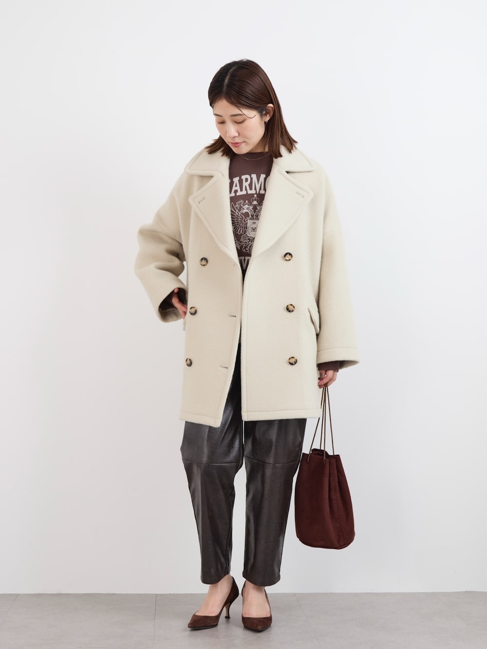 ブラウンのスウェットにブラウンのエコレザーパンツ🧸 薄いイエローのようなライトベージュのコートの色味とすごく合う🤝♡ 冬はモノトーン着がちだけど、今年はブラウンもいいですね🥐 ▷instagram @erk_md_ec