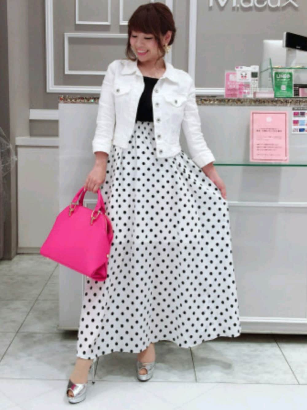 お気に入りなドット女神ワンピースが主役なコーディネート😃❤️ 今日は、ホワイトGジャンで、モノトーンに合わせましたっ✨