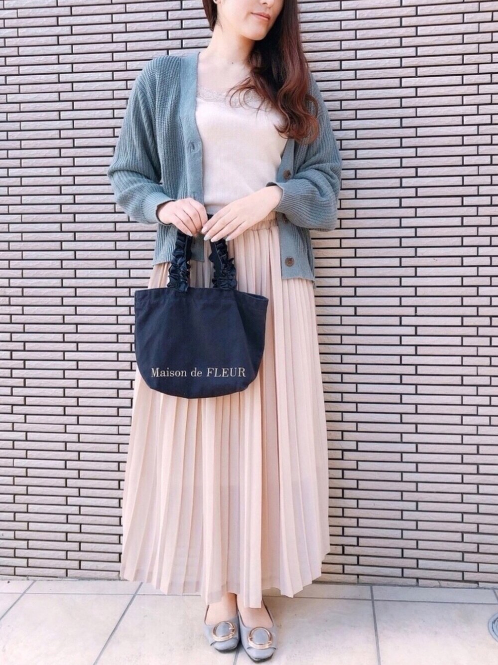 Maison de FLEUR定番の 帆布フリルハンドルトートSバッグをご紹介します。 . ゴールドの刺繍が映える帆布素材のミニトートバッグ。 ボリュームのあるサテンフリルのハンドルリボンが 愛らしい表情をプラス🎵 内側にポケットが付いていて しっかりとしたマチがあるので収納しやすく ちょっとしたお出かけやサブバッグとしても活躍します。 トレンドのミントカラーのドロップショルダーカーディガンに ベージュのプリーツスカートで ゆるめお散歩スタイルに合わせてみました😌