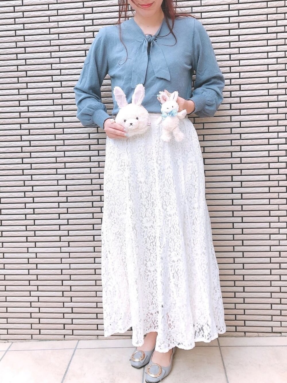 ボウタイリボンが上品なニットに フェミニンなレースフレアスカートを合わせました🌷 スカートは総レースでスタイリングが華やかになります✨ . Maison de FLEUR人気のうさぎのコインケースとバッグチャームと一緒に🐰💕