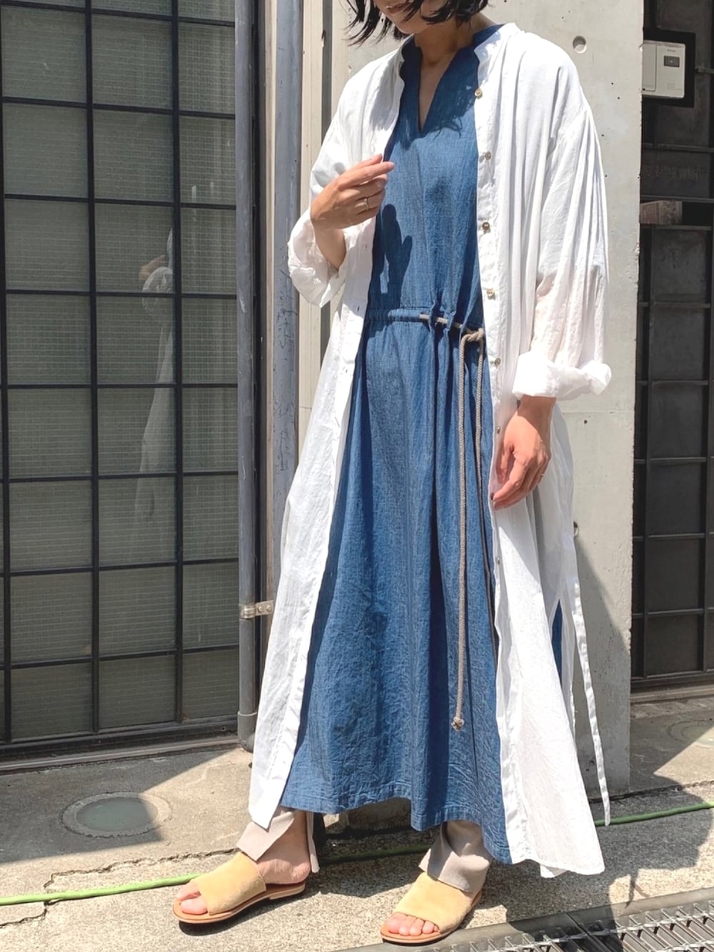 __mu________no__のワンピース「【4.6ozデニム&ストライプ】ドビードローストリングロングワンピース」を使ったコーディネート
