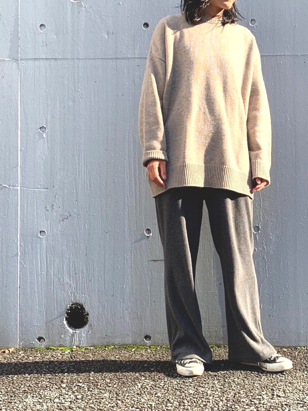 暖かくてコートいらずな今日。 Munich(ミューニック)の ゆるニットと ゆるリブパンツで リラックスモード🍂 このパンツ、 お気に入り過ぎてこればかり履いてる。