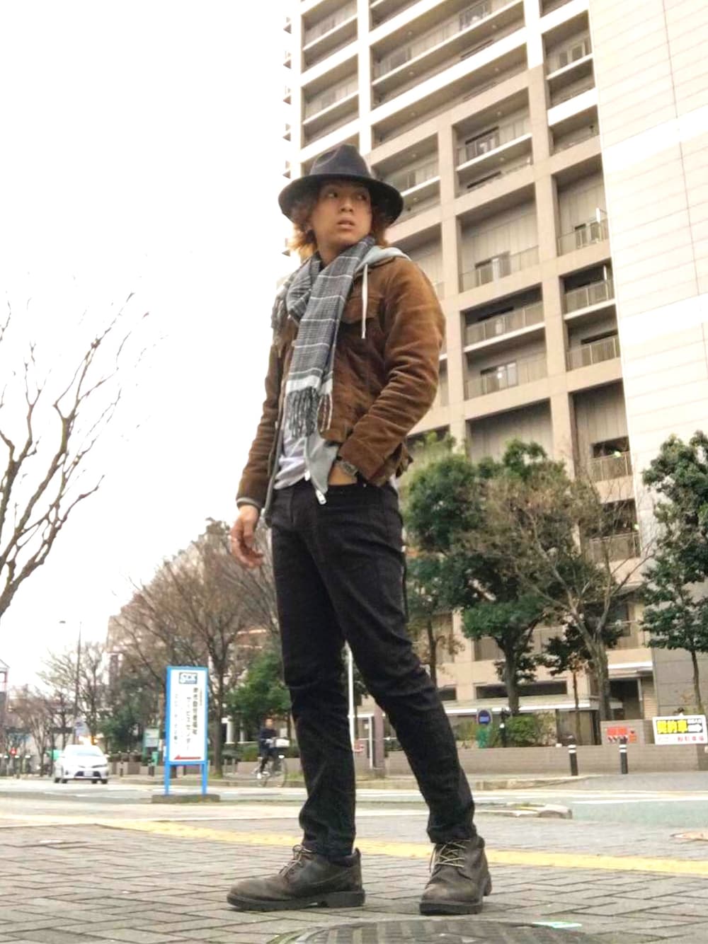 デニムジャケットとパーカーをレイヤードスタイルでコーディネートしました! ハットを被って全体的にクールな大人ファッションをイメージしてコーディネートしてます^ - ^ 黒ハットはつばの広めのハットを被って、 黒のスキニーパンツを履いてます☺️
