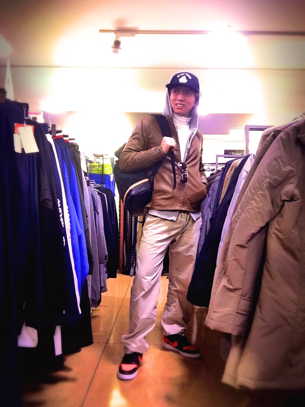 ストリートスタイルの コーディネート^ - ^ ストリート帽子を被った上から フードを被ってストリート感を 出しました✨ インナーにタートルネックで 合わせてみました!(^_^)
