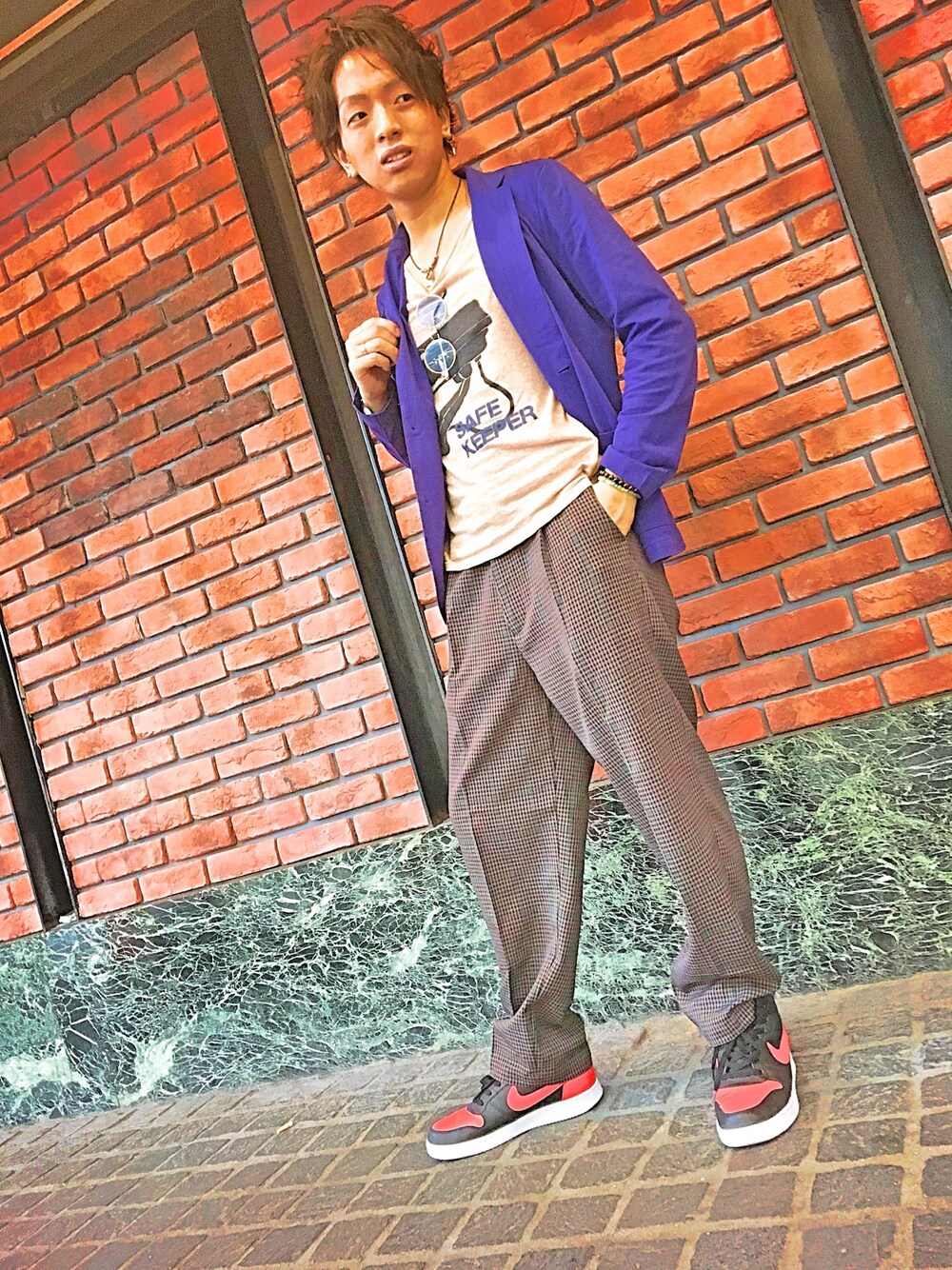 テーラードジャケットと ワイドパンツの合わせた コーディネート✨ 中は柄物のUネックTシャツを着用しました👚