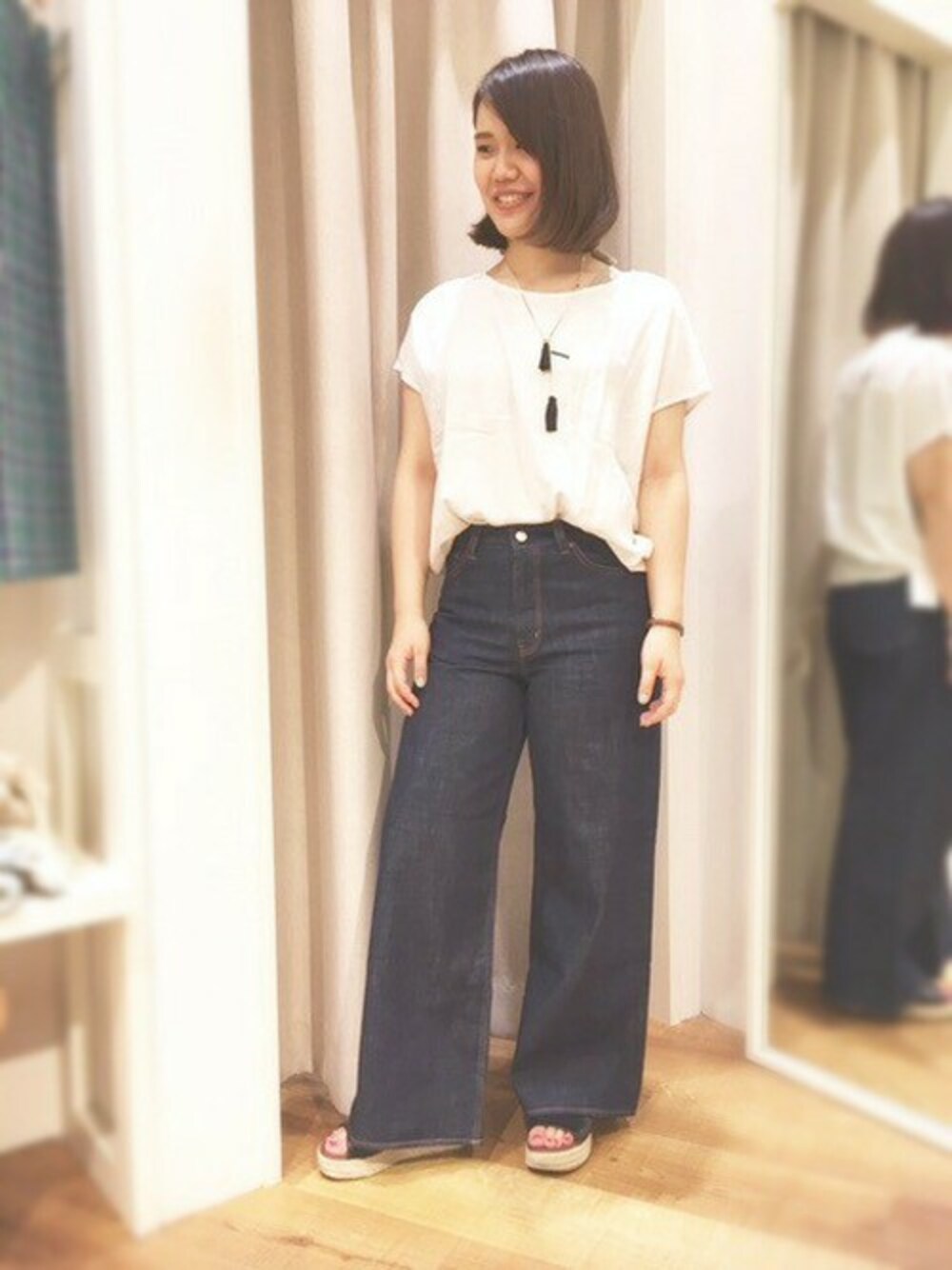 ワイドデニムは生地がとっても柔らかく、シルエットもヒップ周りからストンとまっすぐ落ちてくれるのでカジュアルすぎないエレガントな雰囲気になります♪ トップスは素材が麻とレーヨンなので、テロテロとした生地感が女性らしさを出してくれます。二の腕も隠れるので夏にはありがたいアイテムです!