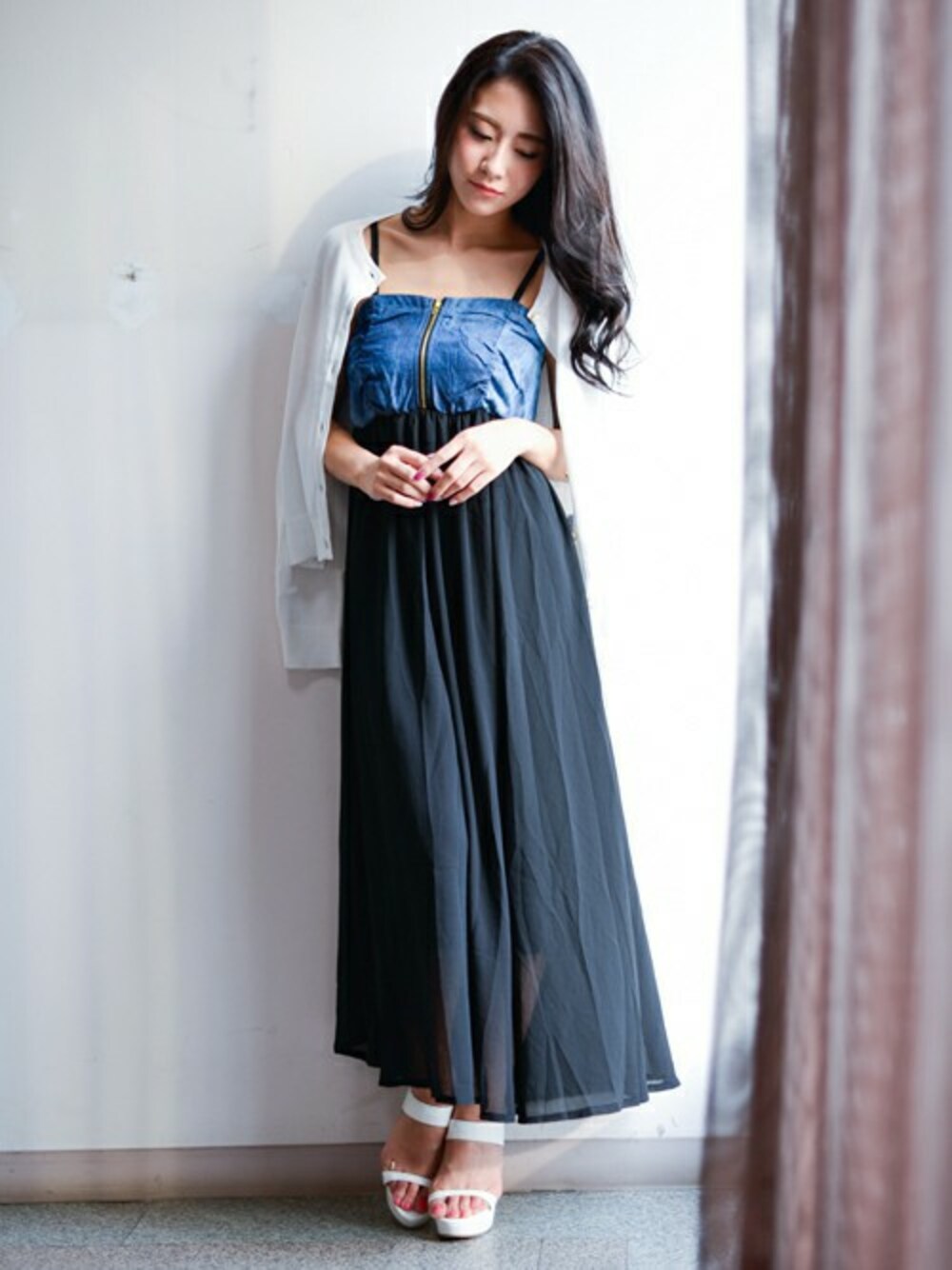 ビスチェ風デニムにマキシスカートがドッキンング☆ 胸のシャーリングがStyle魅せ効果抜群!! またスカート部分はふんわり揺れてエアリーなジョーゼットで高級感を演出 肩紐は長さ可能 さらに肌ざわりの良い裏地付きで着心地も抜群♪