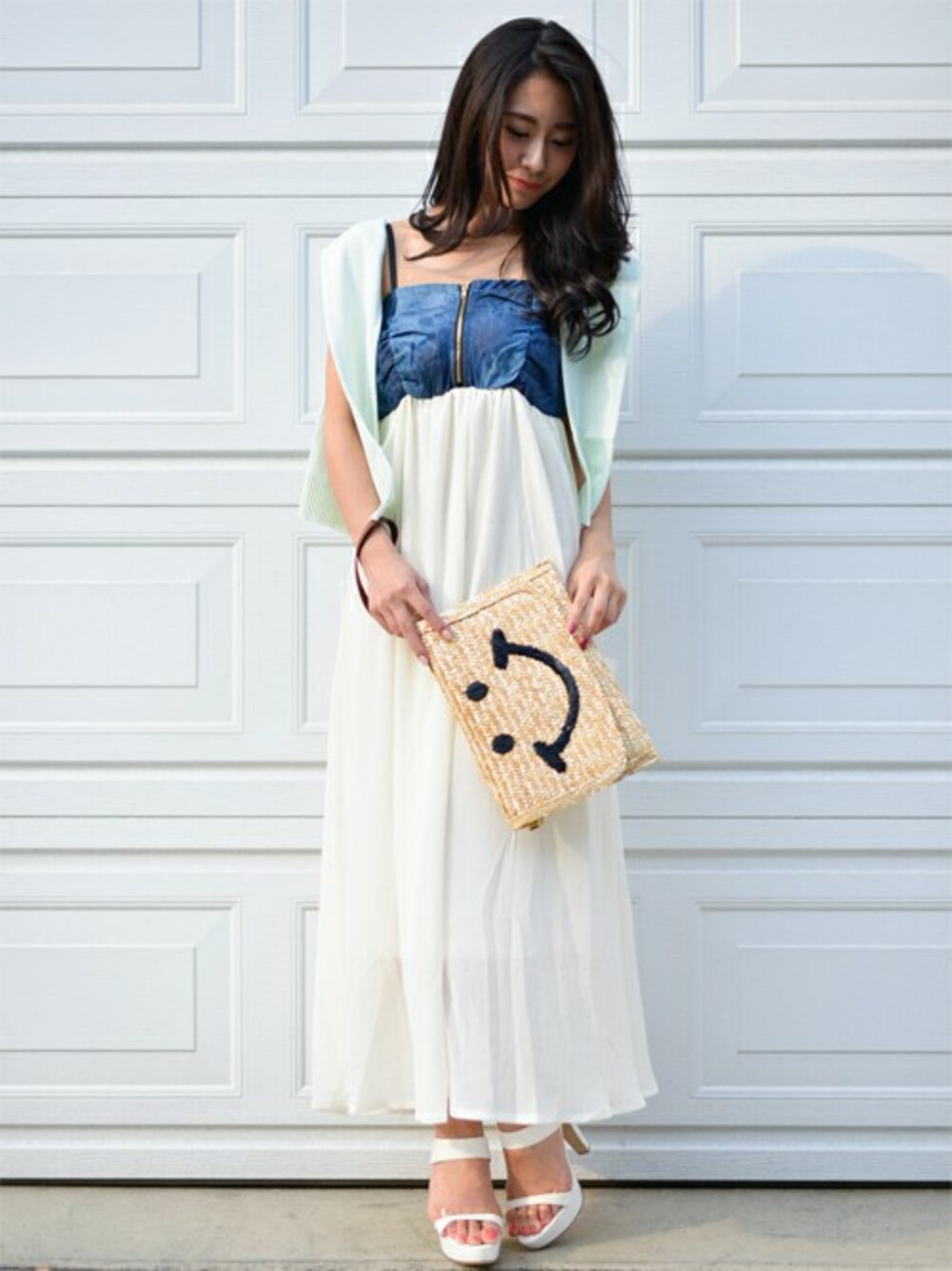 SHIMのワンピース「デニム×ジョーゼットワンピース」を使ったコーディネート