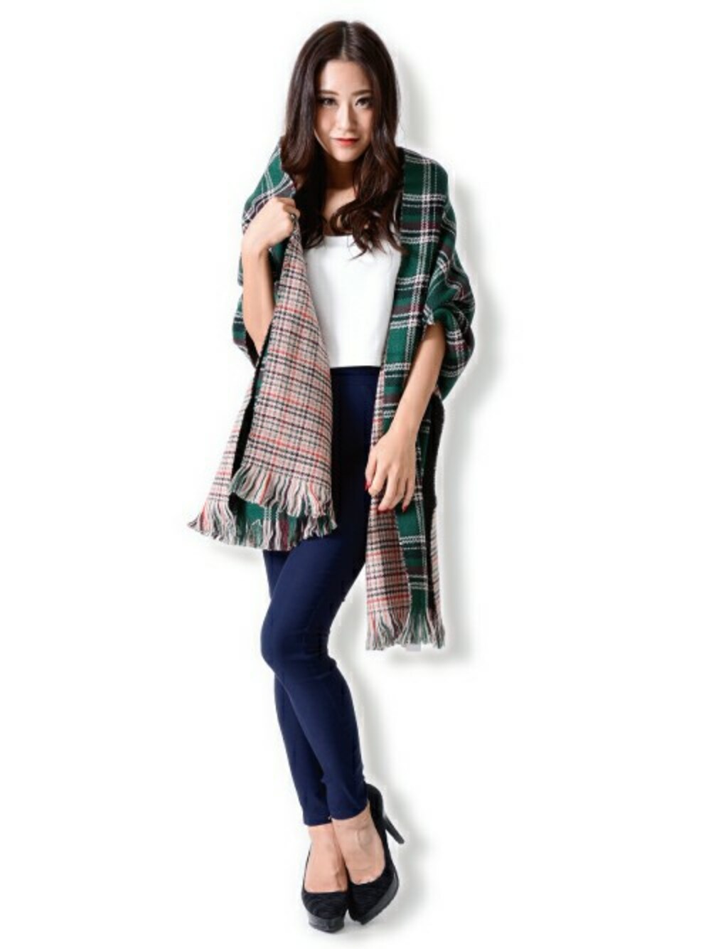 SHIMのストール/ショール「チェックリバーシブルストールA」を使ったコーディネート