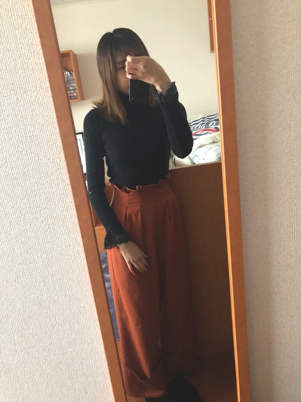 今日のオフィスカジュアル🧡🖤 このEMODAのハイウエストのパンツお気に入り🩳 そして安定のGRL🖤