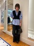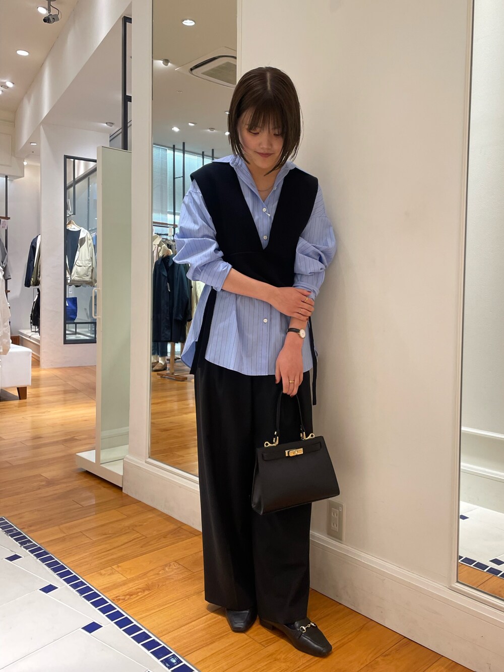 ご覧いただきありがとうございます! 毎年定番人気のMY STANDARADシャツ❣️ 左側のボタンをとめて カシュクール風に着ることもできます 程よくゆったりとしたサイズ間で 前を開けて羽織としても◎ 上からニットビスチェを重ねて レイヤードスタイルにしました! ボトムスはシーズンレスで使えるパンツ 取り外し可能なサスペンダー付き しっかりとワイド感があるシルエットで カジュアルに履いていただけます シワや毛玉にもなりにくい嬉しい素材です✨