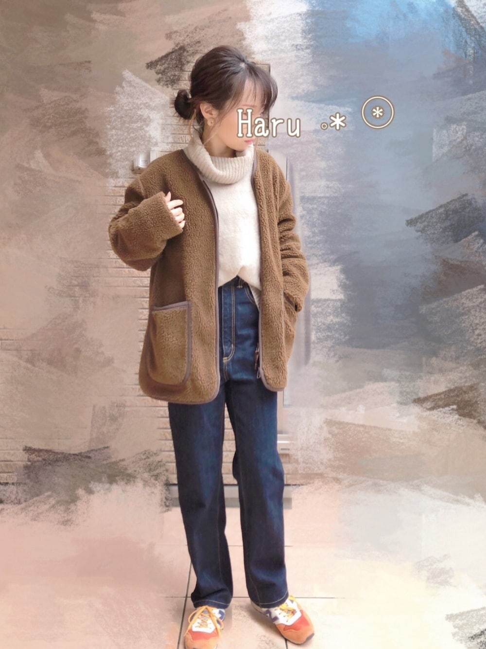 お久しぶりです。°.。❅°. Haruです 2019年 もう残りわずか…☃︎ 早いですね。。。 ボアブルゾンはメンズ(ブラウン) ニット(ベージュ) スニーカー(オレンジ)
