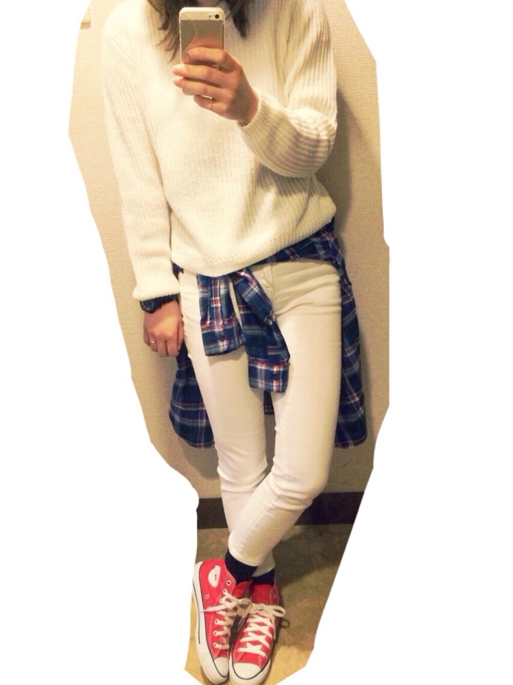 ホワイトコーデ♡ #ニット…チャオパニック #ネルシャツ…UNIQLO #パンツ…UNIQLO #スニーカー…CONVERS 一人映画。 土竜の唄観てきた~