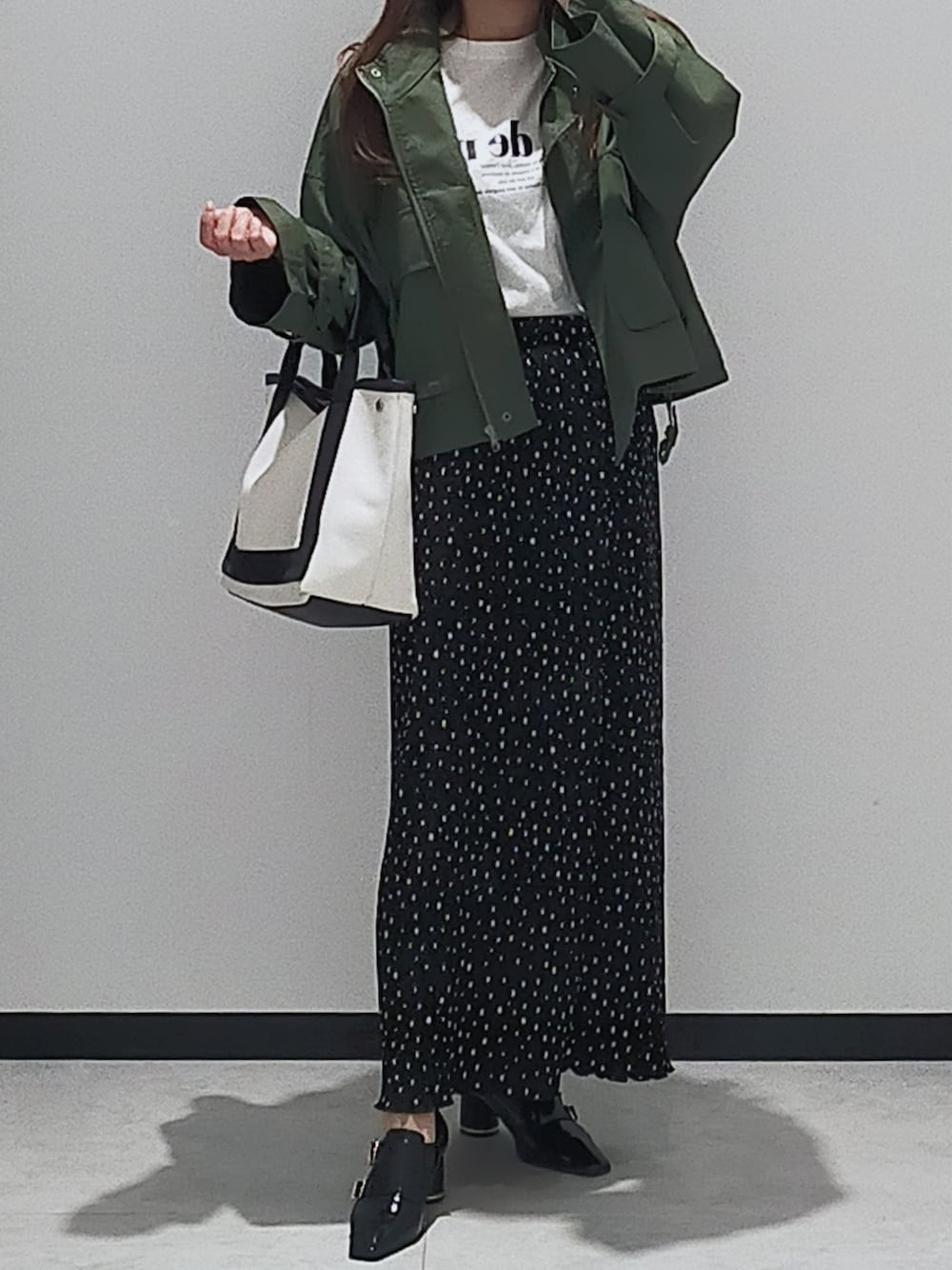 見ていただきありがとうございます🤍 coca さんのドットプリーツスカートで 大人カジュアルコーデに♪ Instagram @___mee.153