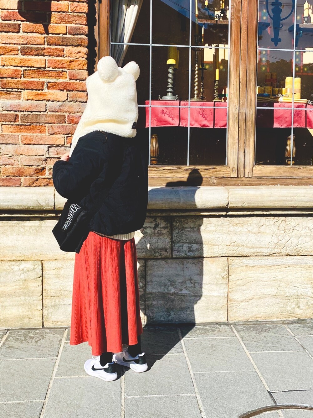 ディズニークリスマス🎄 スカートが私の身長でも 長すぎず短すぎず、絶妙で動きやすい🏃♀️ 寒すぎてミッキーフード現地購入⛄️笑