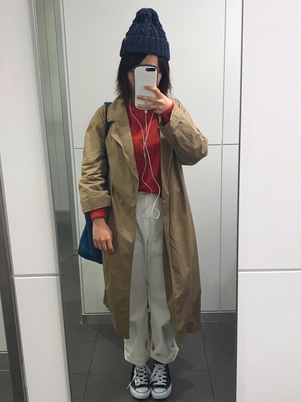 17° 暖かかったのでインナーなしのアウター。 トップスはレンガの色に近いですがトマトという色名のついたワッフルクルーネックです。 この色味のトップスとワッフルクルーネックTが欲しかったので、まさに求めていた1枚でお気に入り。 フレンチカジュアル(←言ってみたかった)な雰囲気にしてみました。