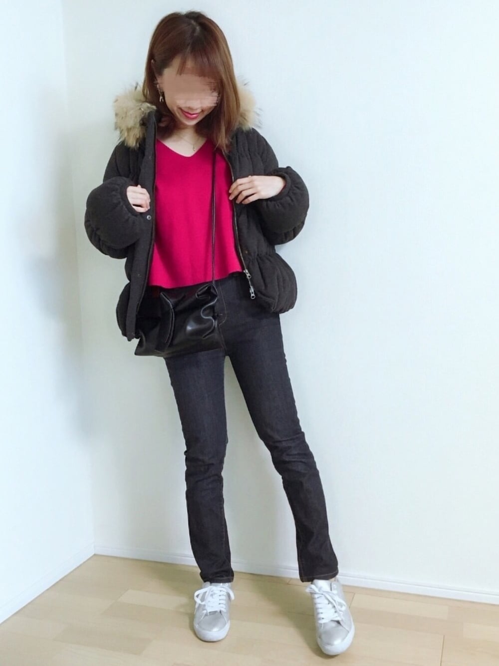 ご覧いただきありがとうございます😊 モッコモコのショート丈ダウン❤️ 久々に着ました♬ シルバースニーカーも久々👟❄️❄️ 断捨離をしようと思ったけれど やっぱり手放せない😂♡