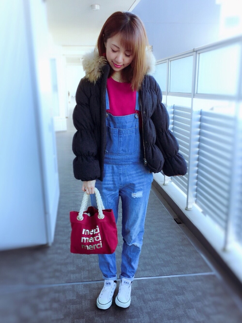 ご覧いただきありがとうございます😊 昨日のご近所お出かけコーデです♪ 自転車に乗ることが多かったので 動きやすさ重視🚴♀️🌈 デニムサロペ‼️ お久しぶり☺️💕💕 クラッシュ部分が寒かった😂💫 ボンレスハムみたいなダウンコート また着ちゃいました♡♡♡