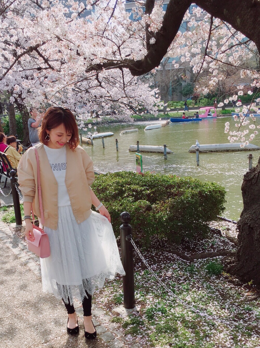ご覧いただきありがとうございます😊 お花見コーデです🌸✨ 白ベースの淡カラーコーデを、 黒で引きしめました⑅◡̈* レーススカートを履くと 一気に春感が出るなぁ🦋*✲゚*