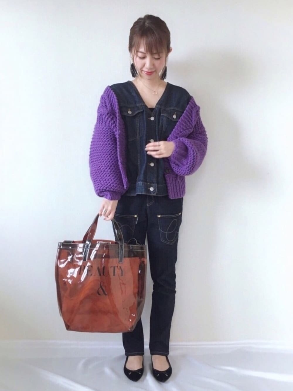 デニム on デニムに パープルのニットカーディガン💜 去年ゲットした、お気に入りの クリアバッグ👜 また今年も使うぞー😊✨ インスタ▷▷▷meme158cm