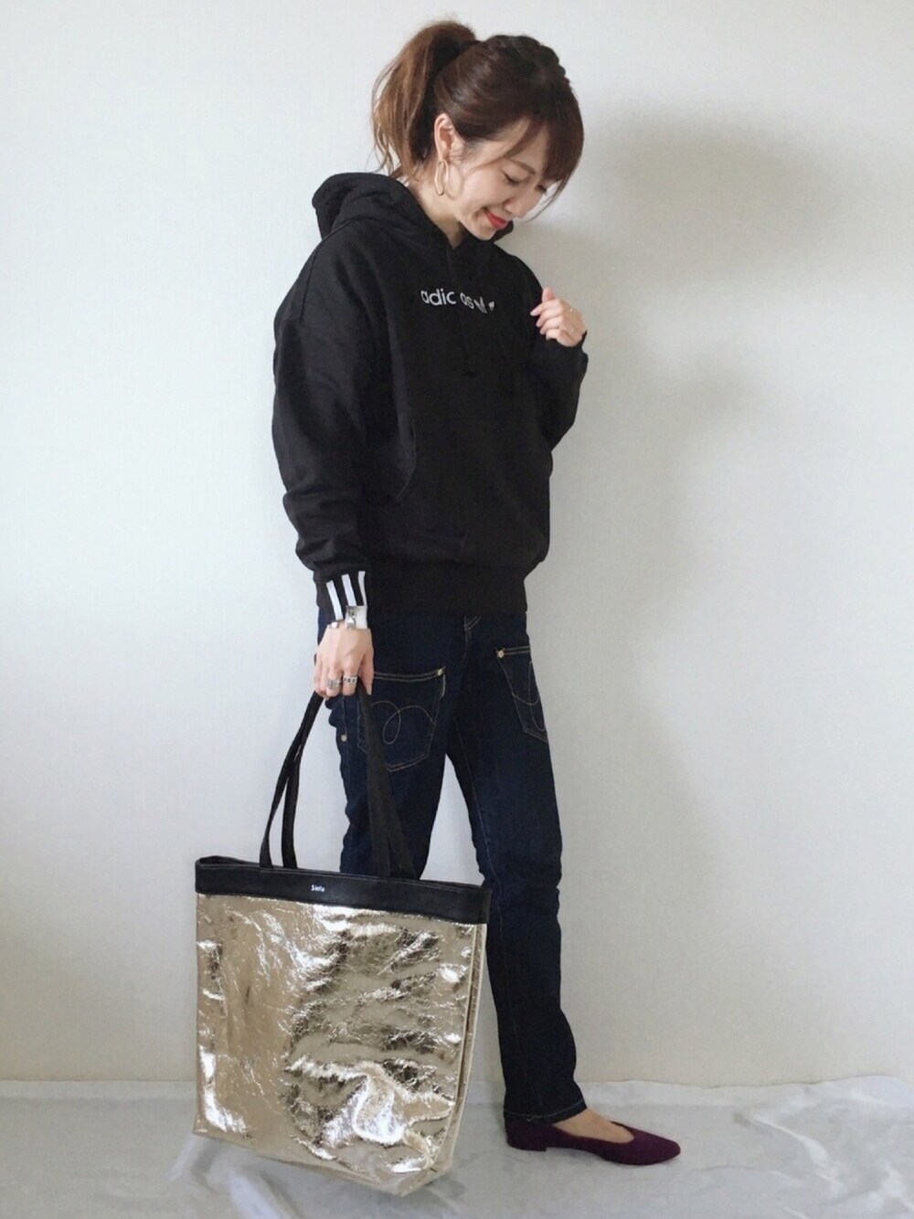 メタリックのトートバッグが主役のコーデ ❤︎ パーカーとポニーテールは 最近マイブーム😋✨ インスタ ▷▷meme158cm PARTE