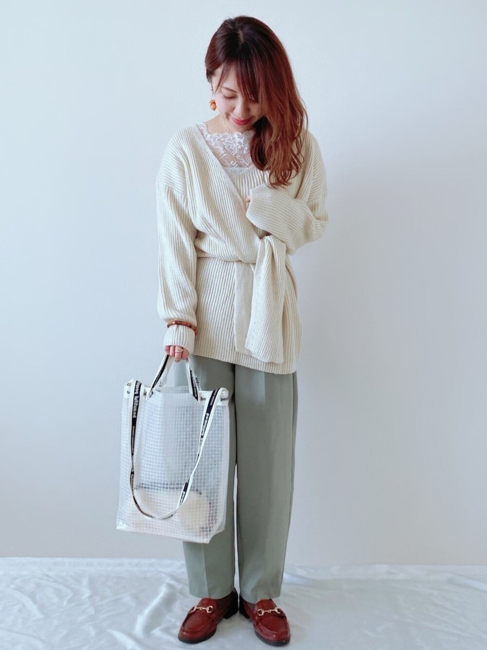 くすみグリーンが可愛いパンツ🌿 お気に入りすぎる♡ リボンニットとも相性良しーー👍💕 Instagram ▷▷meme158cm PARTE