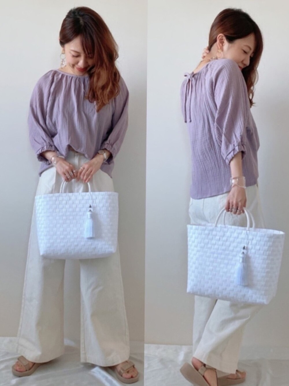 春を感じるカラーコーデ🌸 柔らかなガーゼのトップスがNew✨ RETEL( @retel__rakuten )の 【ダブルガーゼドルマン五分袖ブラウス】 商品番号 6820614 春らしいパープル🍇/フリーサイズ 158cmの私で腰くらいの丈♩ インするのもちょうどいい◎ とにかく軽く、肌触りがとーっても良くてストレスフリー♡ これから暖かくなる季節にも良いと思います😊 バックスタイルにリボンもあるので、後ろから見てもオシャレ✨ (ショップはインスタから飛べます✈︎) ホワイトとゴールド小物で透明感のあるコーデに..♡なったかな?🌿 #pr Instagram ▷▷@meme158cm PARTE