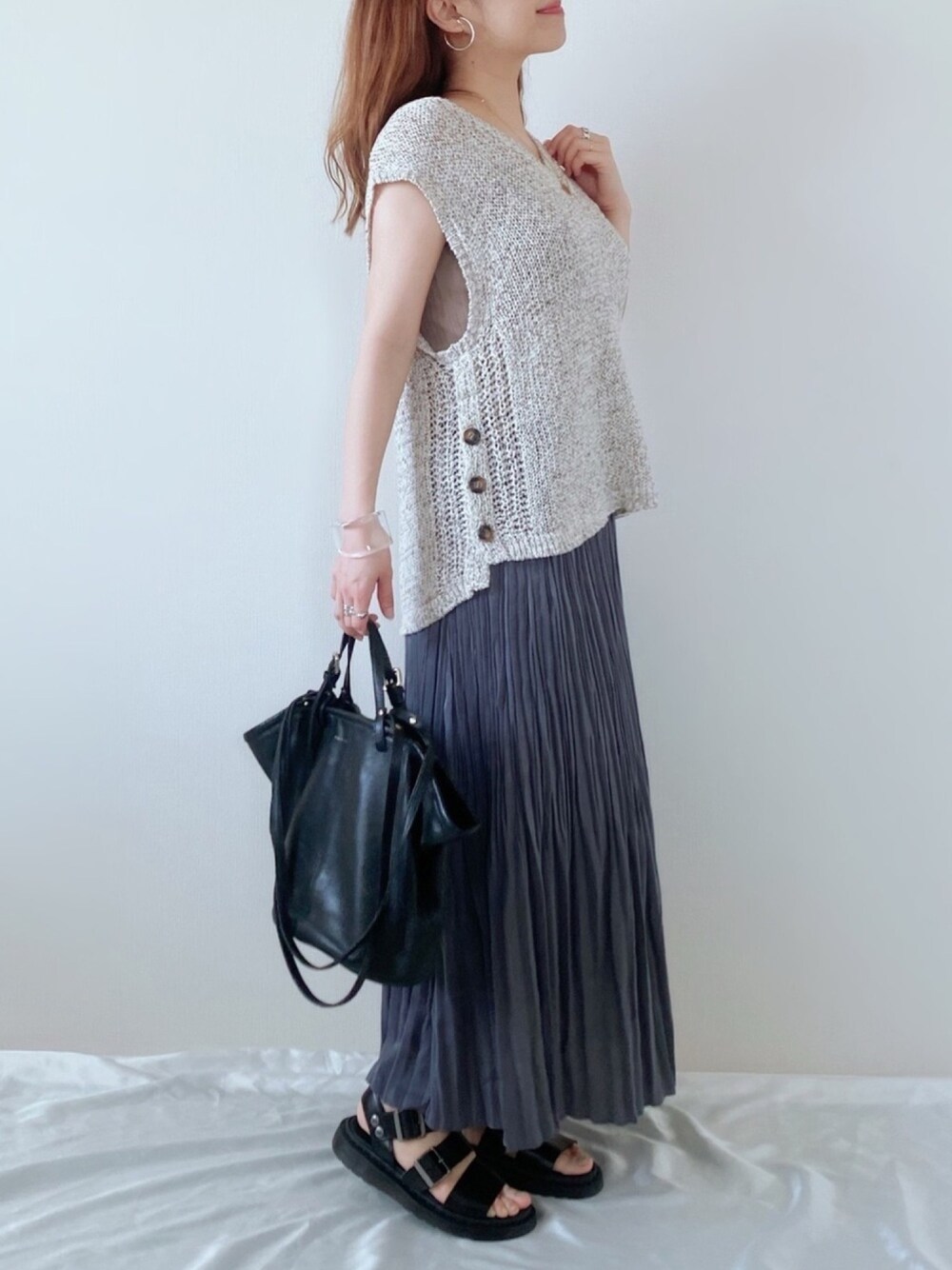 Dr.Martensのサンダル🖤 足元ゴツメが好き。 これからの季節に使えるニットベストは、 ざっくり編みで涼しい🌿 Meli richのものです♡ Instagram ▷▷@meme158cm PARTE