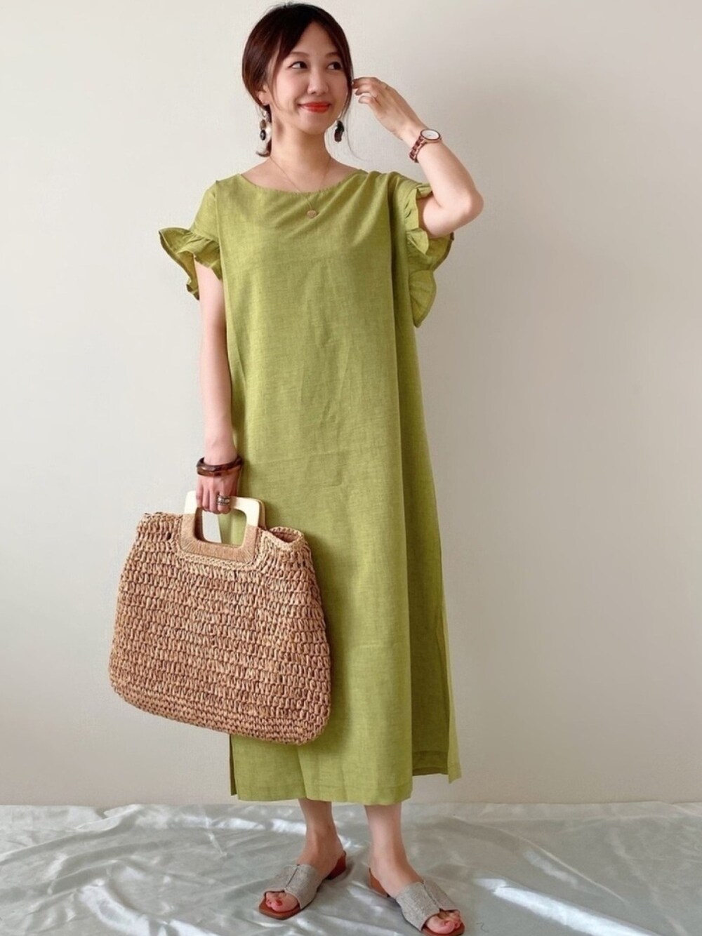 lime green × brown🌿 とっても夏らしいコーデ𓂅 ワンピとバッグがNewin! aquagarage(アクアガレージ)さんのものです♡ ワンピは、お袖のフリルが可愛すぎ𓇼 大人でも着られる、上品なフリルです☺️✨ 両側スリット入りで動きやすく、サラッとした肌触り◎ これからの季節にもピッタリ࿐ サイドから見ても可愛いワンピです! そして、バッグ👜 ウッドバングルが、一気に夏を感じさせてくれます♩ ペーパー素材のかごバッグ𓂅 柔らかくて使いやすく、ファスナー付きで、ありがたい〰︎ 👏 色々なコーデに合わせやすそう! インスタには別アングルも載せてます♡ ぜひ、遊びに来てください☺️ Instagram ▷▷@meme158cm PARTE